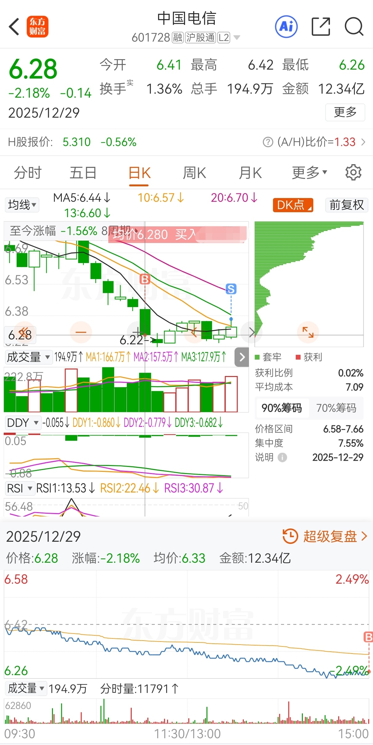 原计划今买明卖,实际6.28买,一直持股不动,6.36卖,实盘短线套利中国电信,