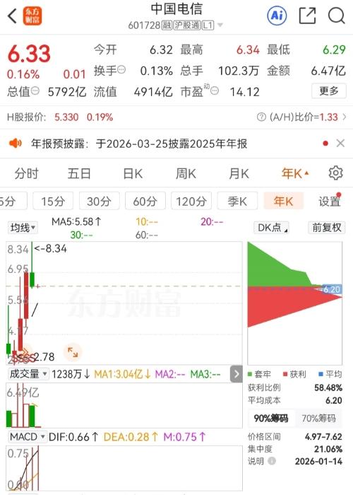 $中国电信(SH601728)$  这股在更低位的筹码一大把吧,他们也无所谓涨跌了,5块以上入的才是煎熬的