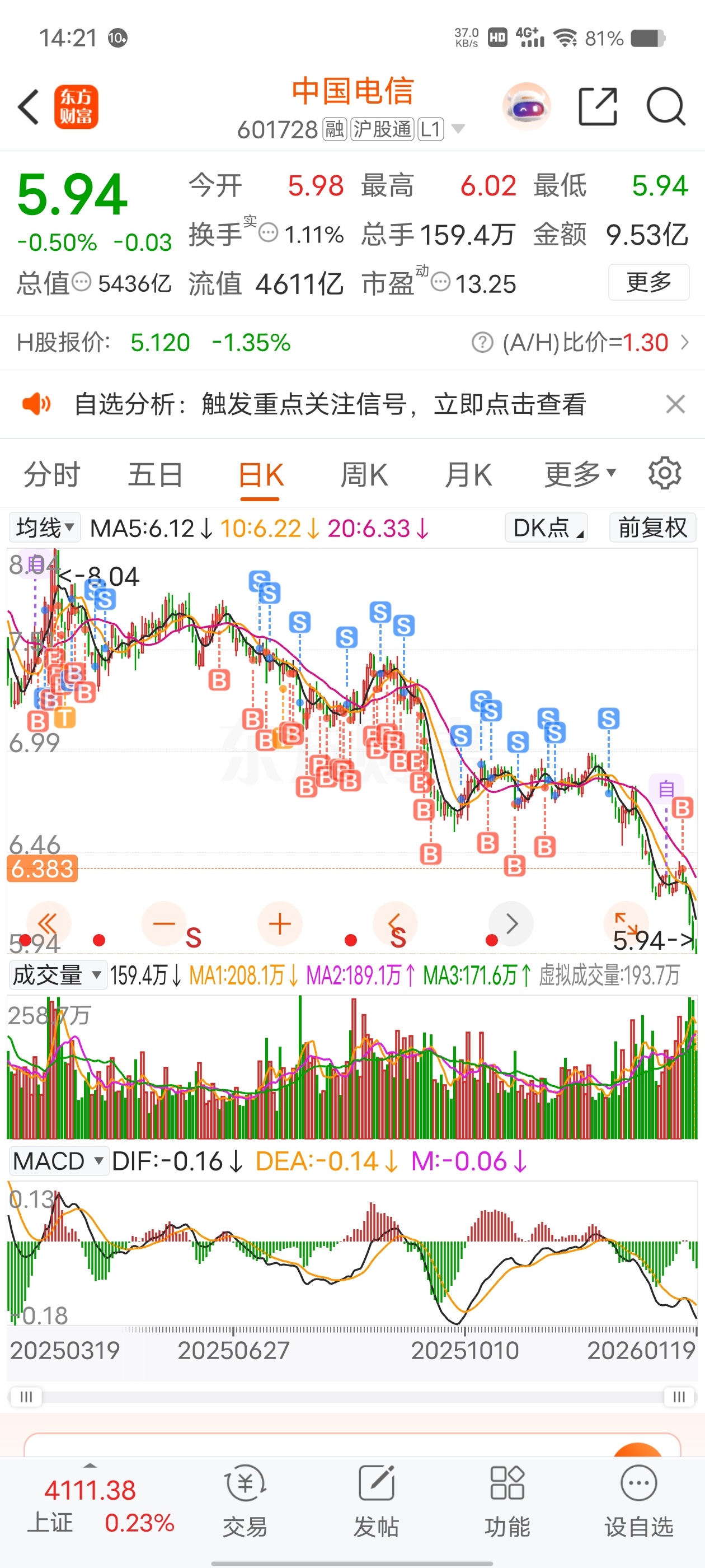 $中国电信(SH601728)$ 我给你拼了,一定把你买倒闭,在这上面亏了好几万,就不卖,看你拉不拉,把你干破产也算值了