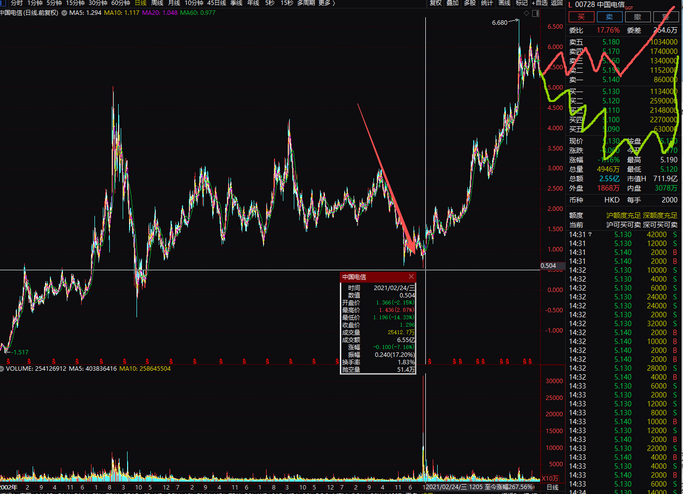 抄底,补仓,加仓的人脑海中以为的价值投资是画的红线,以为价格就是会一步步一个台阶往上走,但实际上根据港股的走势,大致就能判断出电信往后的走势,大致走势是绿线,阴跌几年下跌出货,把21年1月抄底进来的那些巨量筹码卖出,获利差不多10倍,阴跌N年一个轮回再回来炒,