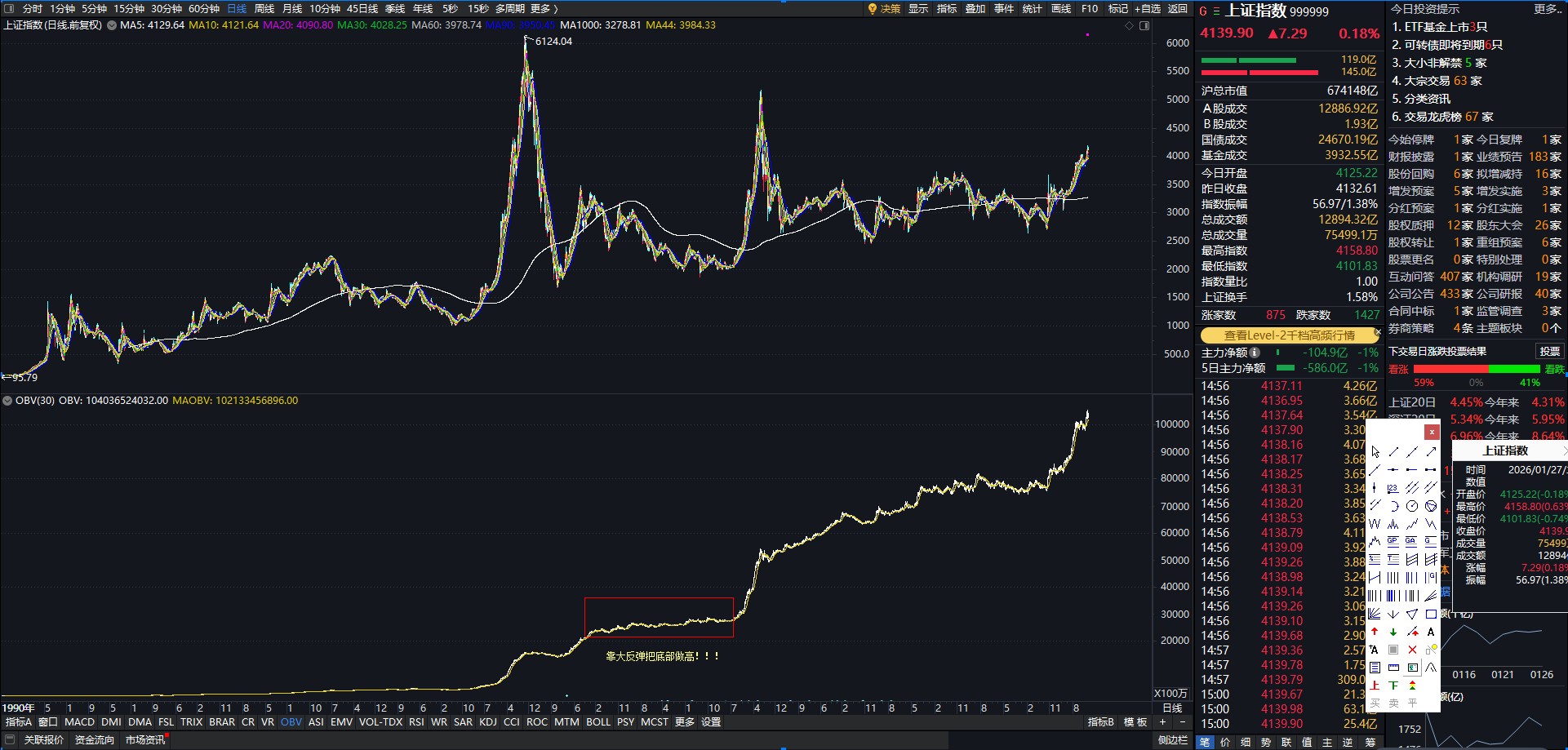 细节问题 为什么很多股~股价不复权没有历史新高,但十几年OBV的重心却一直向上呢《除非退市》主要控制白线的运行速度~K线的大小与白线的速度有一定关系,比如中大阴线白线往下砸的狠,反弹两三天幅度小~白线回去的高度虽然不够,但重心下移的很缓慢,下跌通道中利用大点的一段反弹,OBV金叉一段时间,股价重心没上移,OBV阶段新高~通过这样的长期运转,加大点的反弹~玩顶背离《指标高,股价比前高点低》再次回落,再利用一段阴跌~小阴小阳盘整,OBV在某一个区间长时间运行不下移了,就是再砸盘,OBV很久不会再破前面的低点了,反反复复利用一段长时间横盘,控制重心下移的速度,主要是借助比较大的反弹,金叉快速把白线拉起来~按年来看~股价总体重心是下移的,OBV重心确向上的~熊市就是这样被控制运行的,不愁没大的反弹!!!