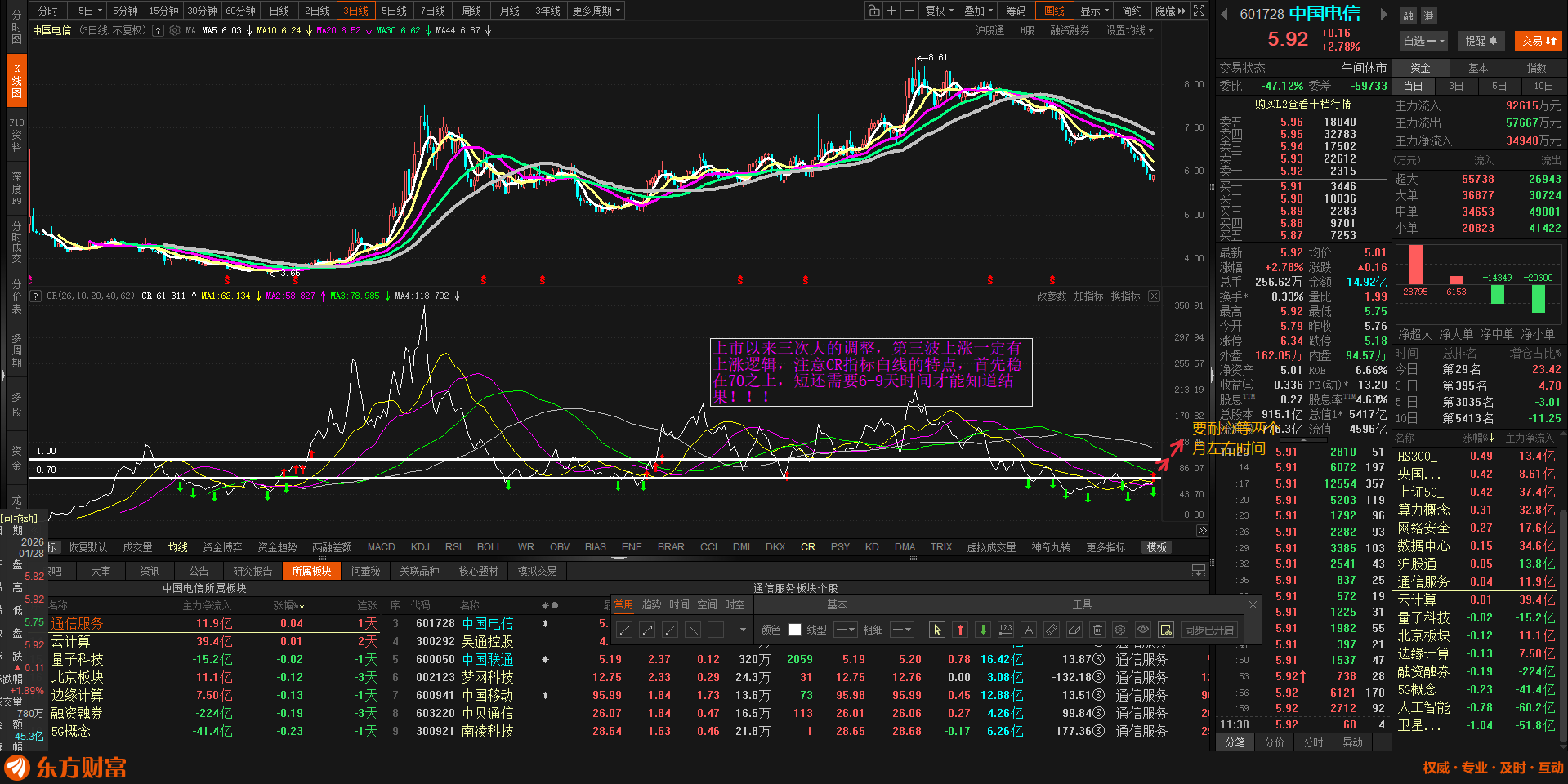 OBV这个特点我们要搞清楚~电信上市四年多了,OBV还在负值~这是很多股上市几年一个共同的特点,人保不到一年白线彻底脱离负值,现在是正的八位数;洛阳钼业几个月就结束了负值;中国建筑上市就是负值~五年多脱离负值,现在正九位数;京东方现在达到十位数了,几个大银行几个月,一年左右就脱离了负值~这些大市值股票~上市后都经过了一段负值时期~5-10年的股票都要告别负值的,特别大市值个位数的股票!!!