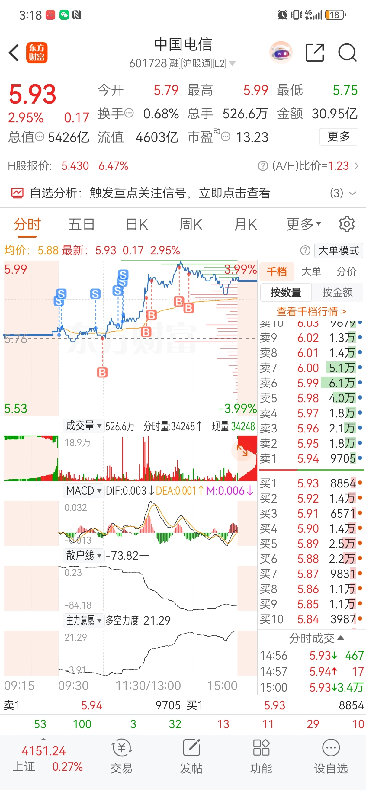 $中国电信(SH601728)$ 今天看走眼了,难得,感谢主力大哥的红包