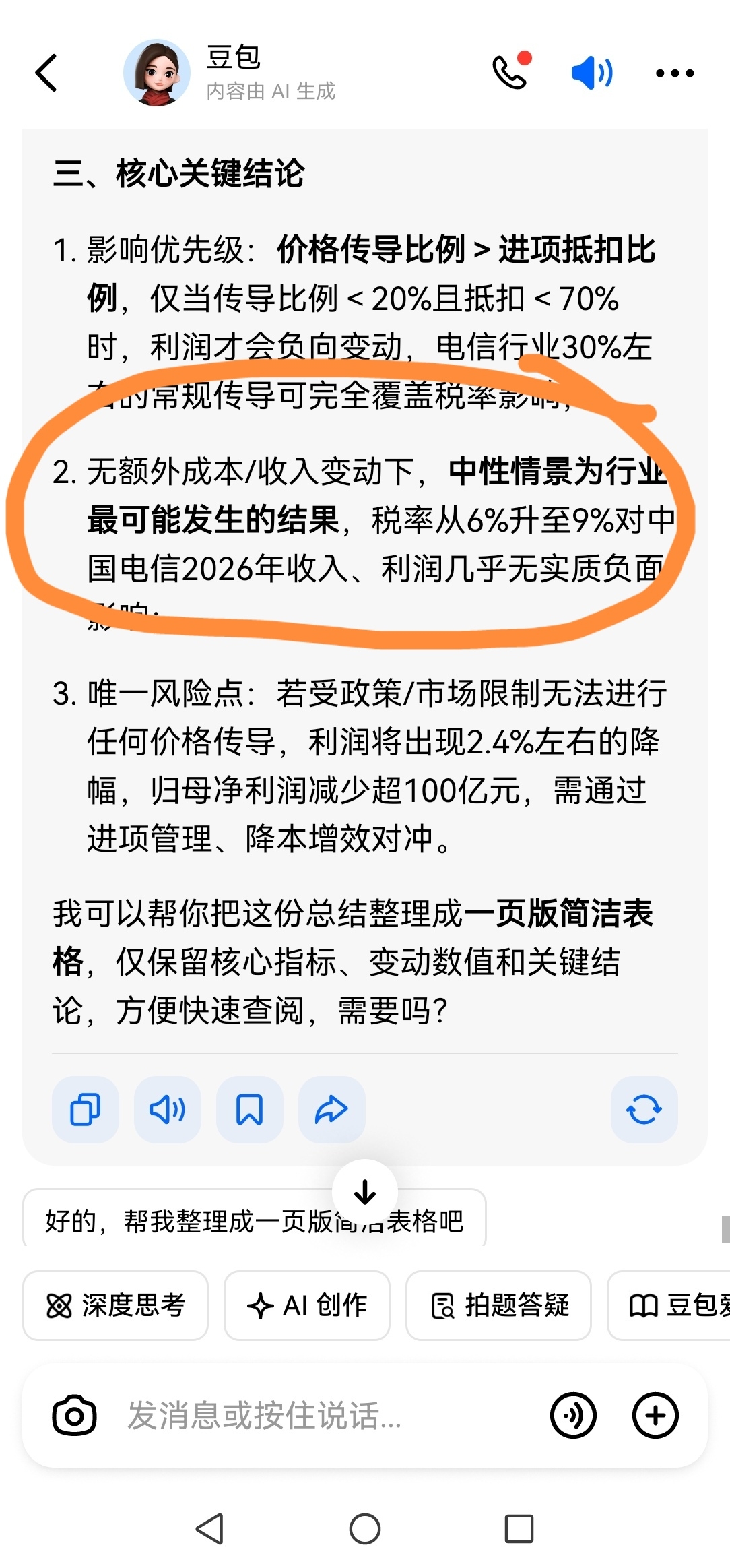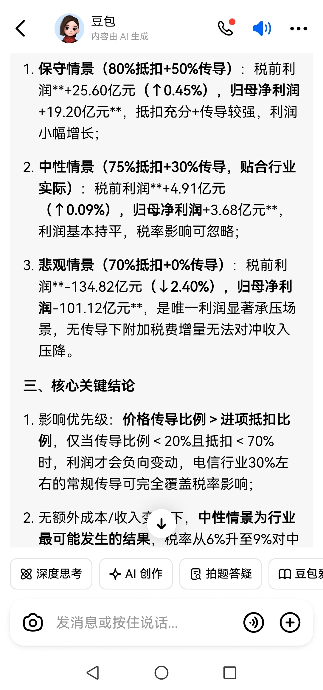 $中国电信(SH601728)$ 中国电信重磅利好分析:我来帮大家分析下税收问题,中国电信从8.6元跌到现在6元的情况下,利空出尽就是利好,关键税率的调整不是利空,可以问问豆包,总结:中性考虑的话,税率影响可以忽略不计!