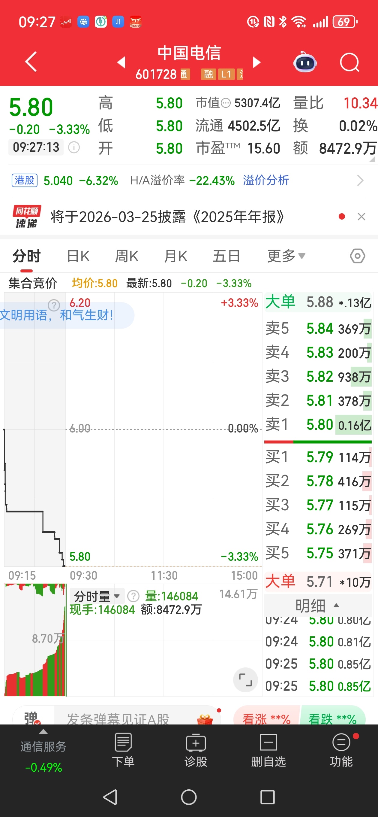 $中国电信(SH601728)$ 今天可能会触碰跌3个点的位置,补仓的可以挂5.80-5.76补单。
