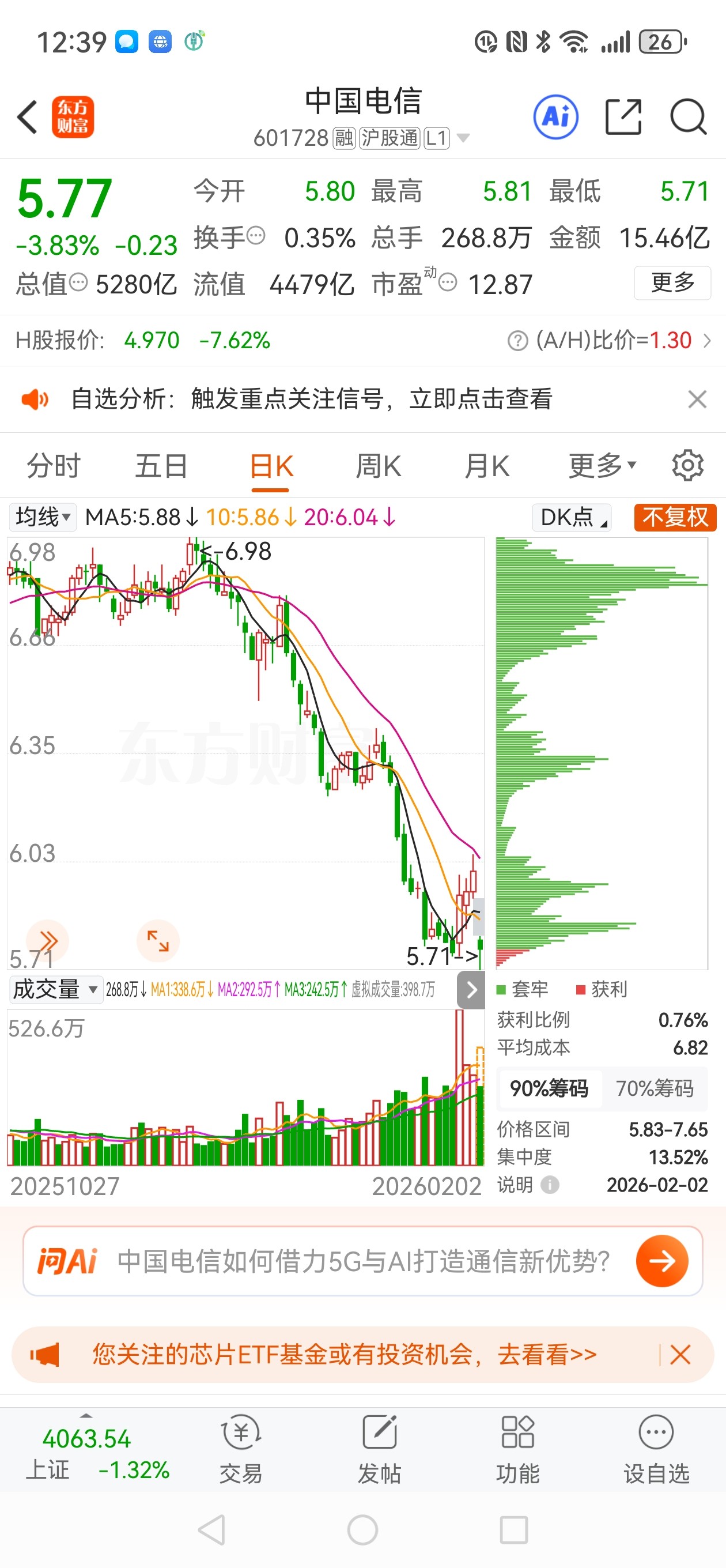 中国电信今天低开3.33%开盘价5.80