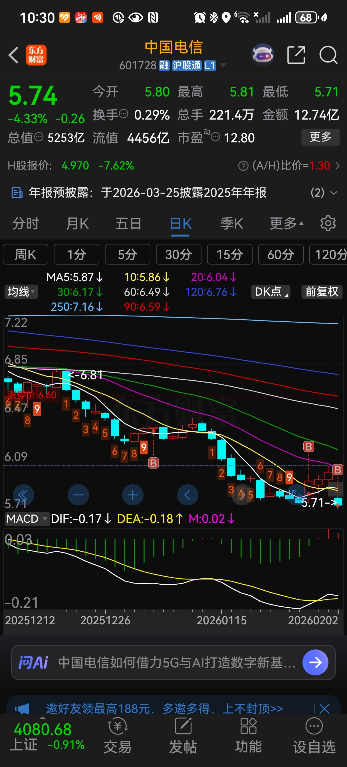 $中国电信(SH601728)$ 5.74加仓,只买不卖,收集股权