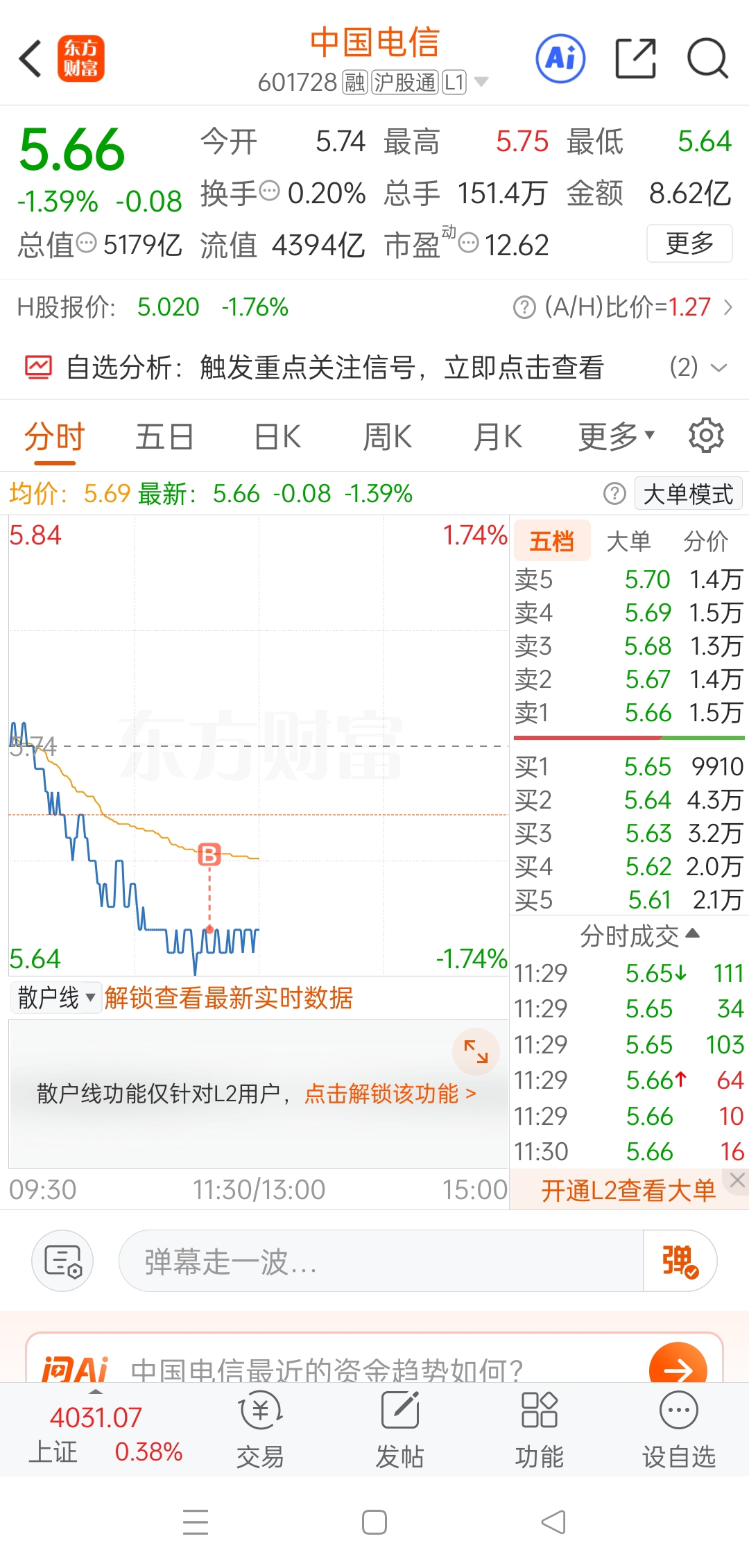 $中国电信(SH601728)$ 5.66买进去,感觉这价再跌也不会很多了,该涨了~