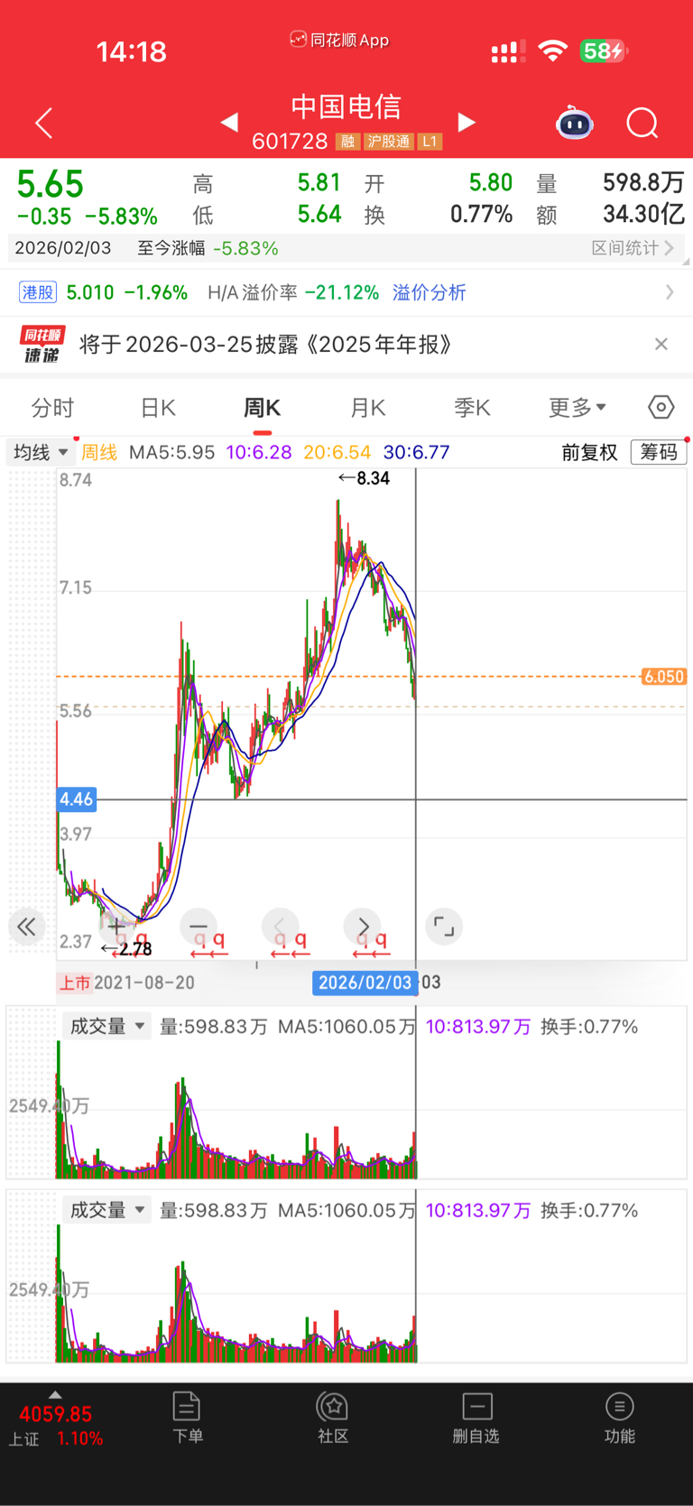 $中国电信(SH601728)$ 500手,上周刚买就深套我,等企稳加倍仓