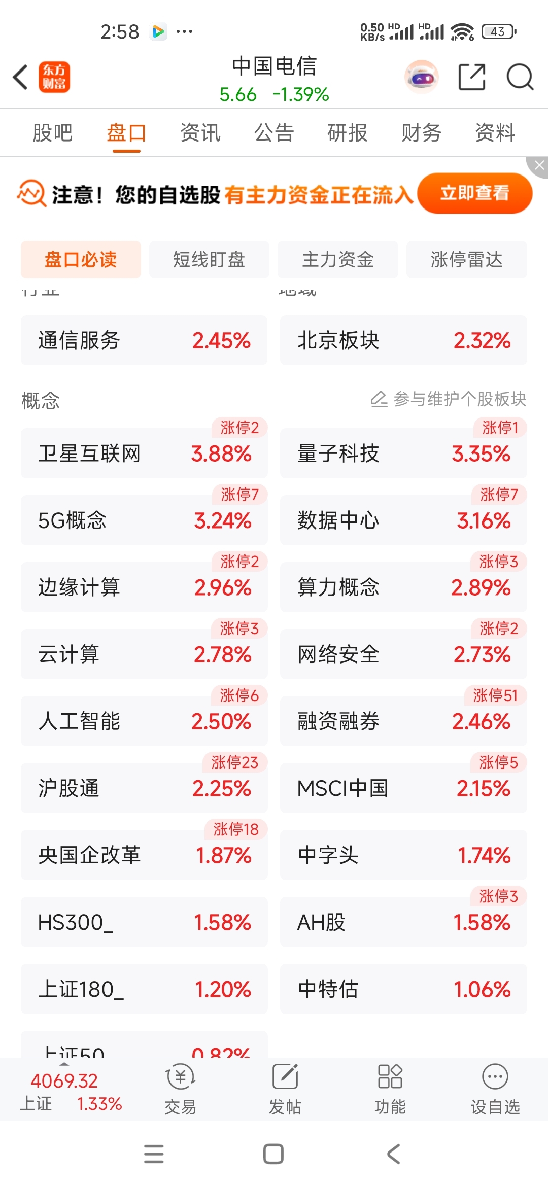 $中国电信(SH601728)$ 勾热的,所有概念板块都红的,它居然还绿