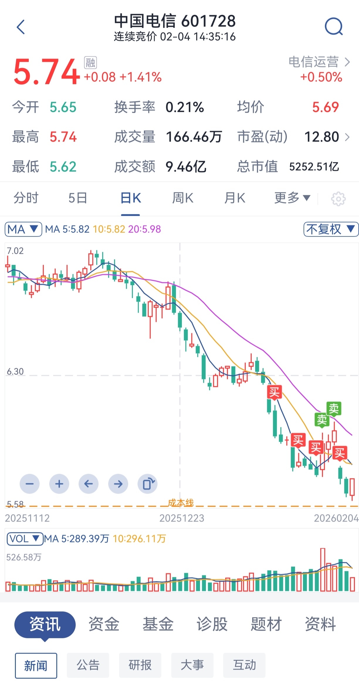 $中国电信(SH601728)$ 做了几个T,成本马上下来了,老娘技术资金都是没得说的。
