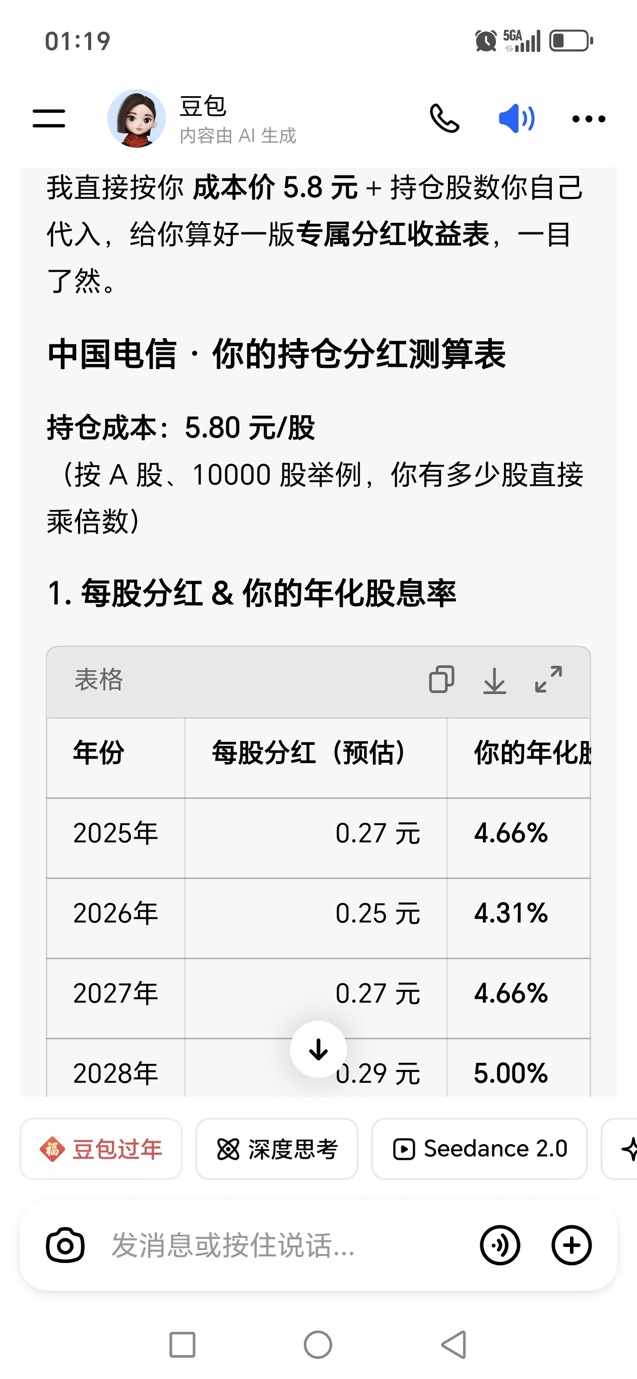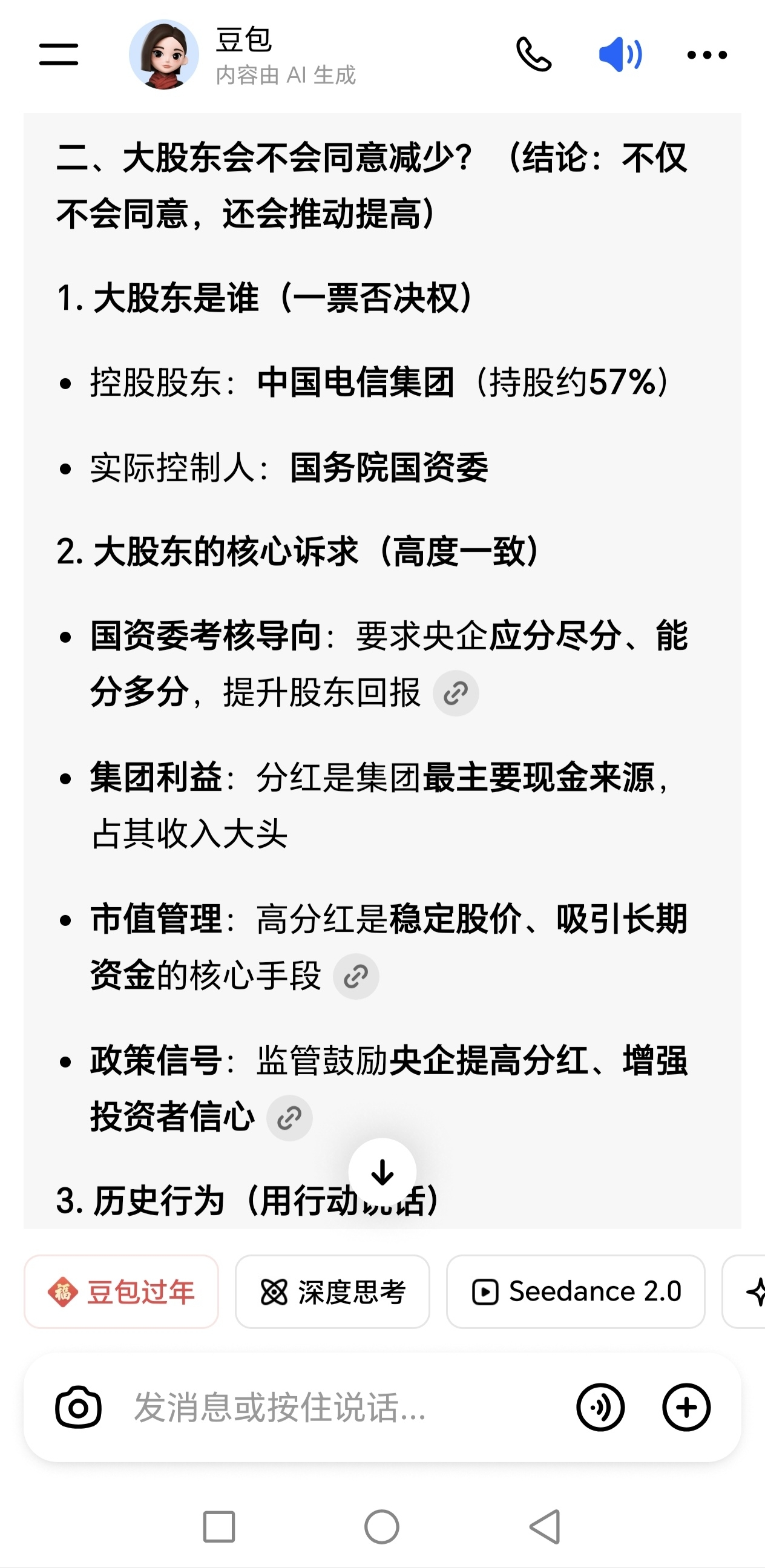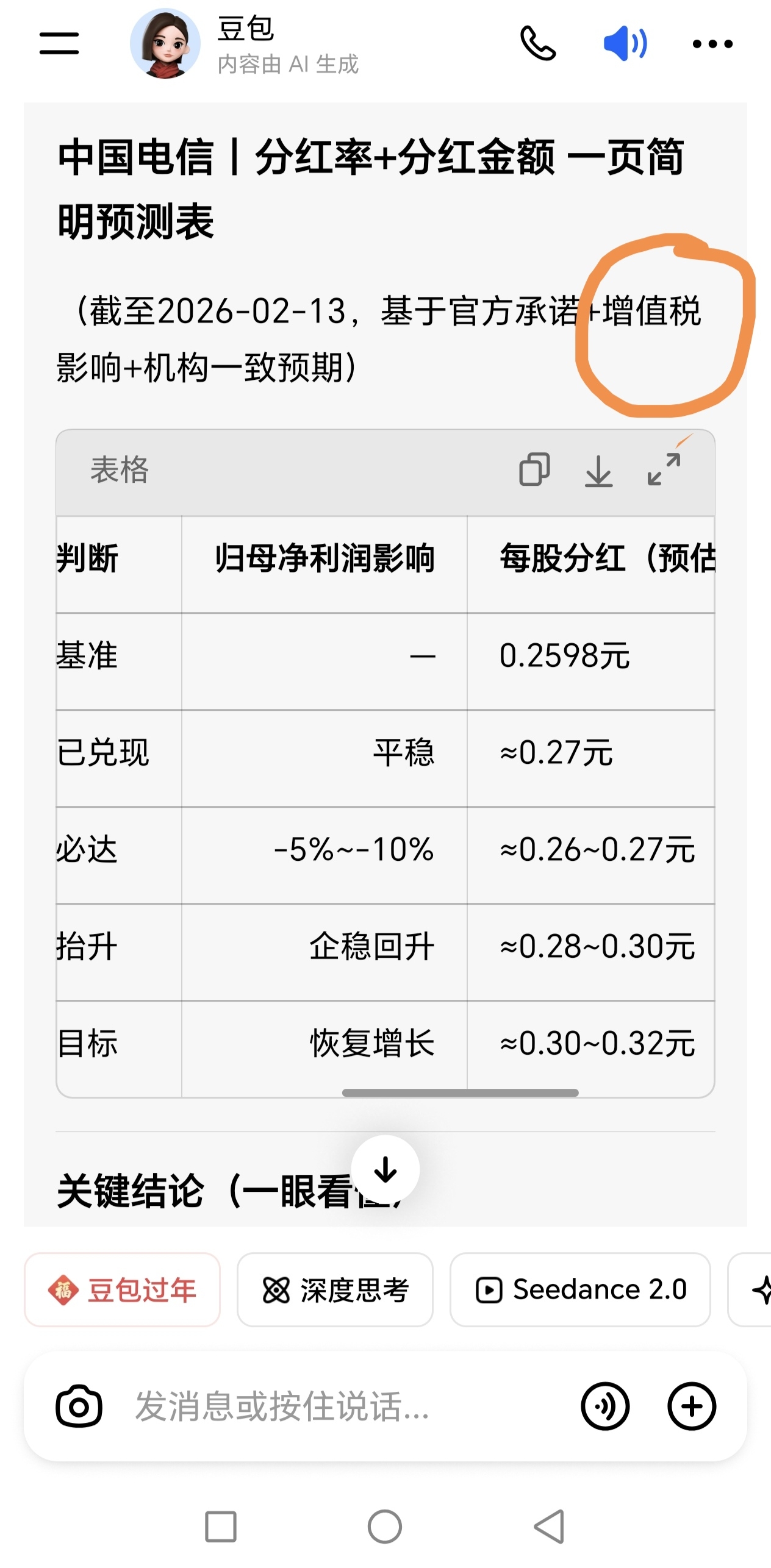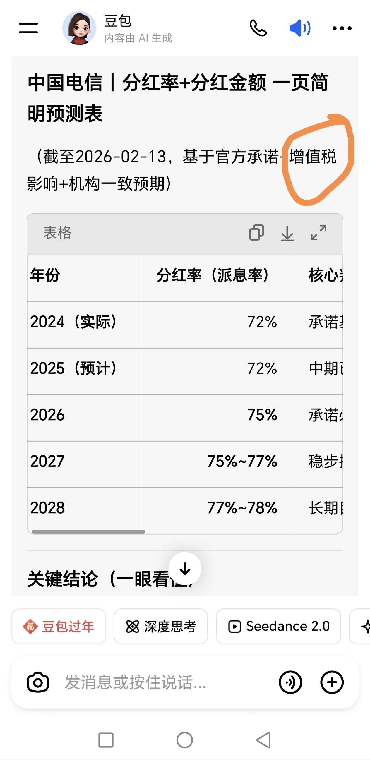 $中国电信(SH601728)$ 重磅利好分析:增值税提高已经考虑进去,3年7个月可以拿1.1元的分红,我问了智能AI,哈哈百分5左右的分红,我认为足够了!要跌继续跌吧!我全部股票都抛了,就剩中国电信,哈哈,我等着你下来,由高位股转到你这低位股!也不看看大股东是谁!有什么好担心的,分红又少不了你,哈哈,现在是股价越低越好!