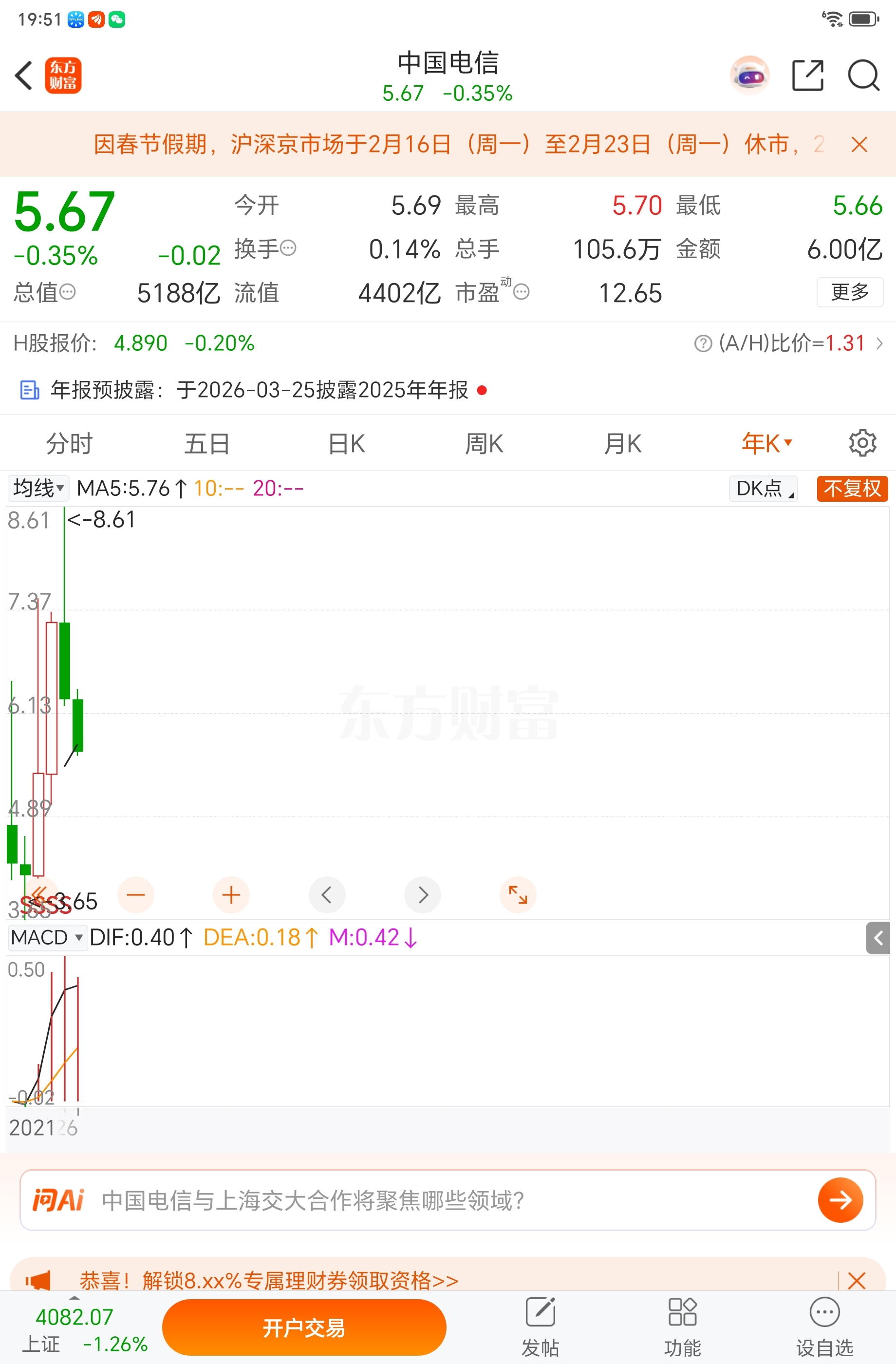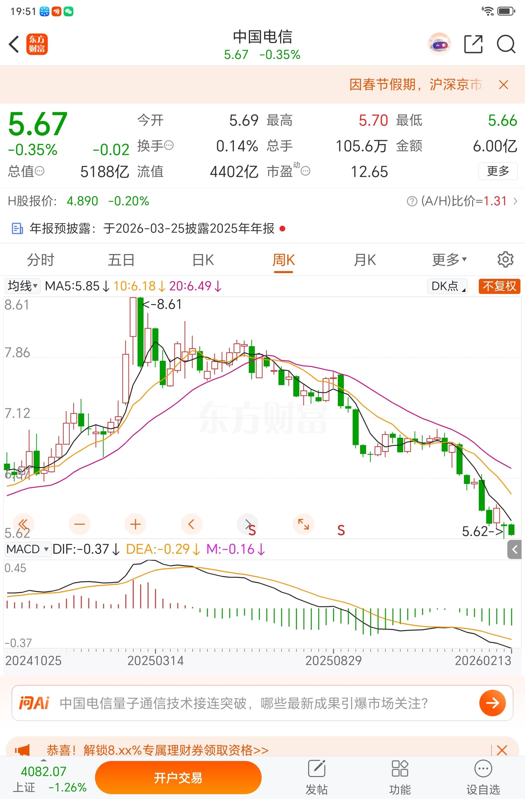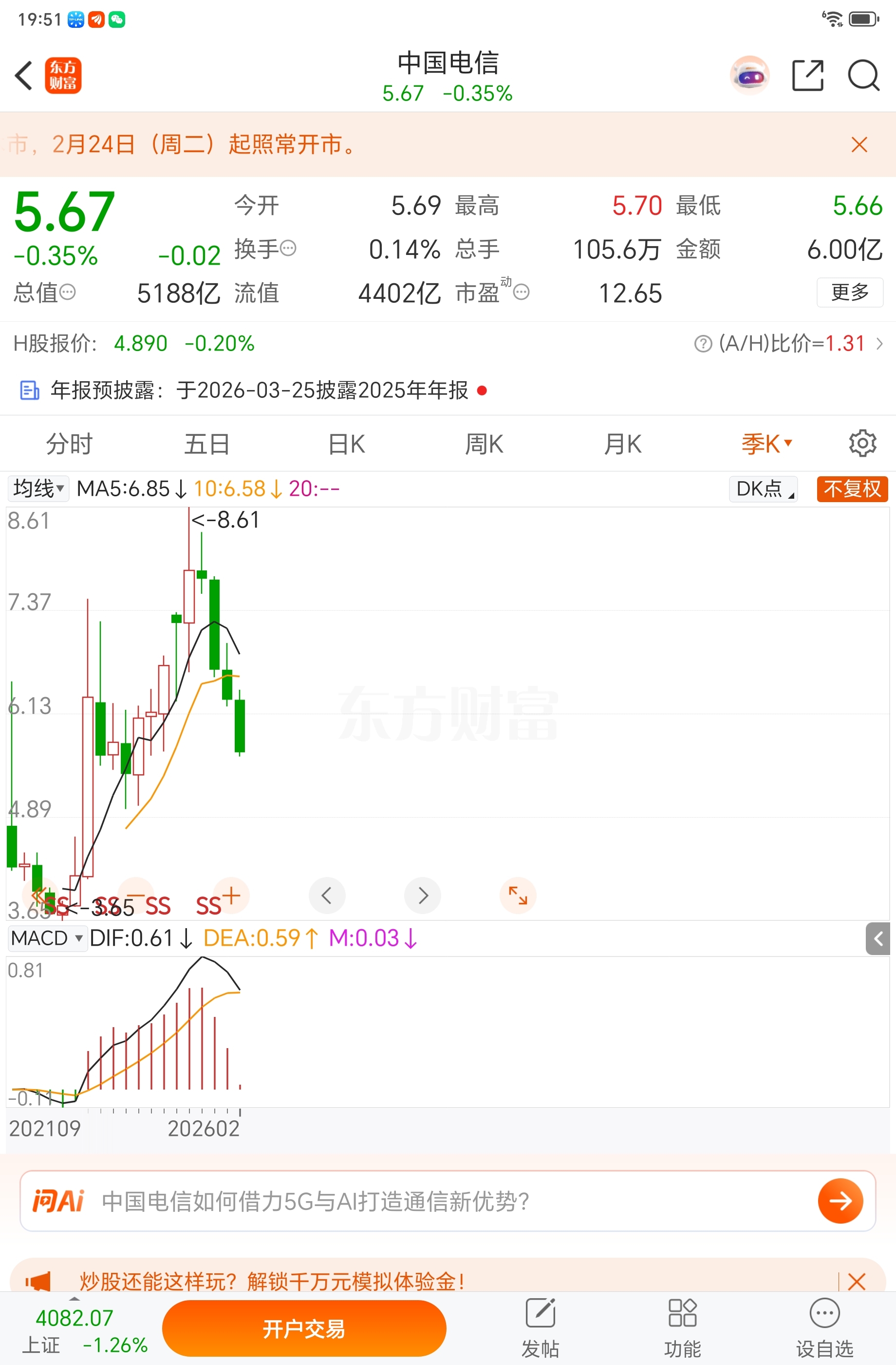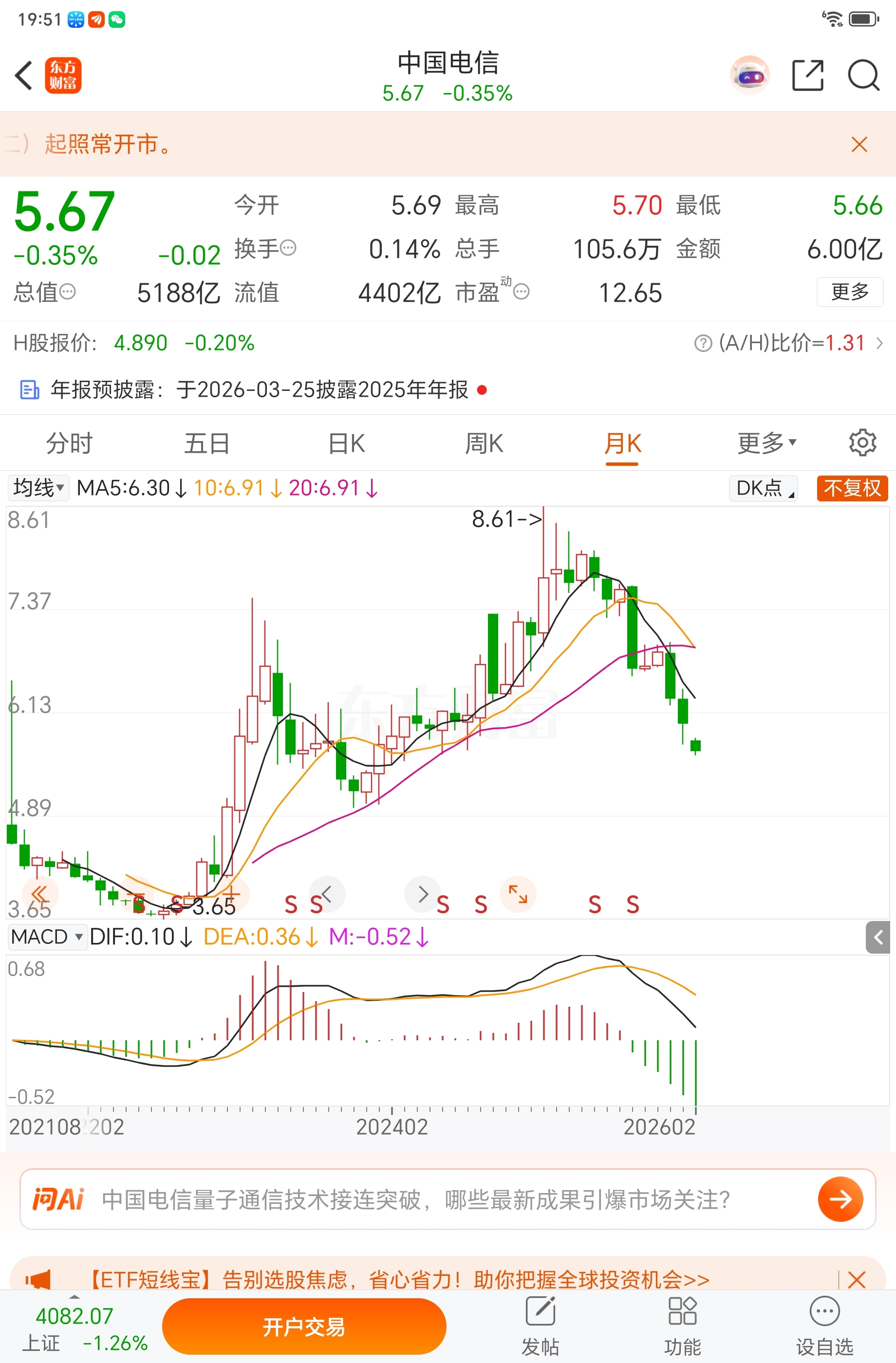 $中国电信(SH601728)$ 破位,难反转!