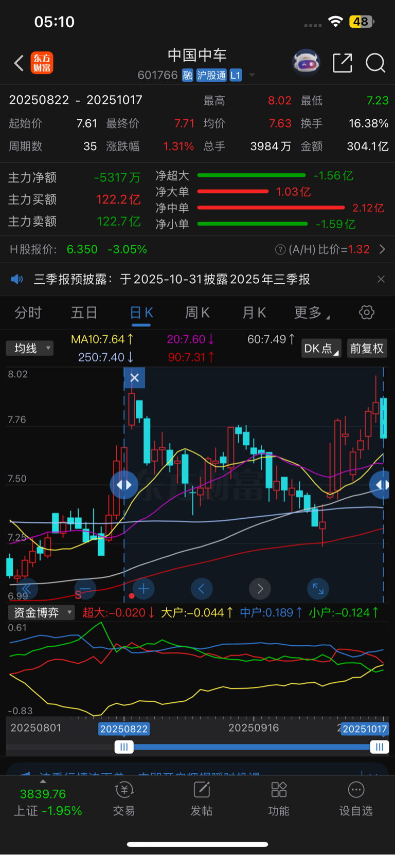 $中国中车(SH601766)$ 主力净卖5300万元。均价7.6元。所以7.45可见