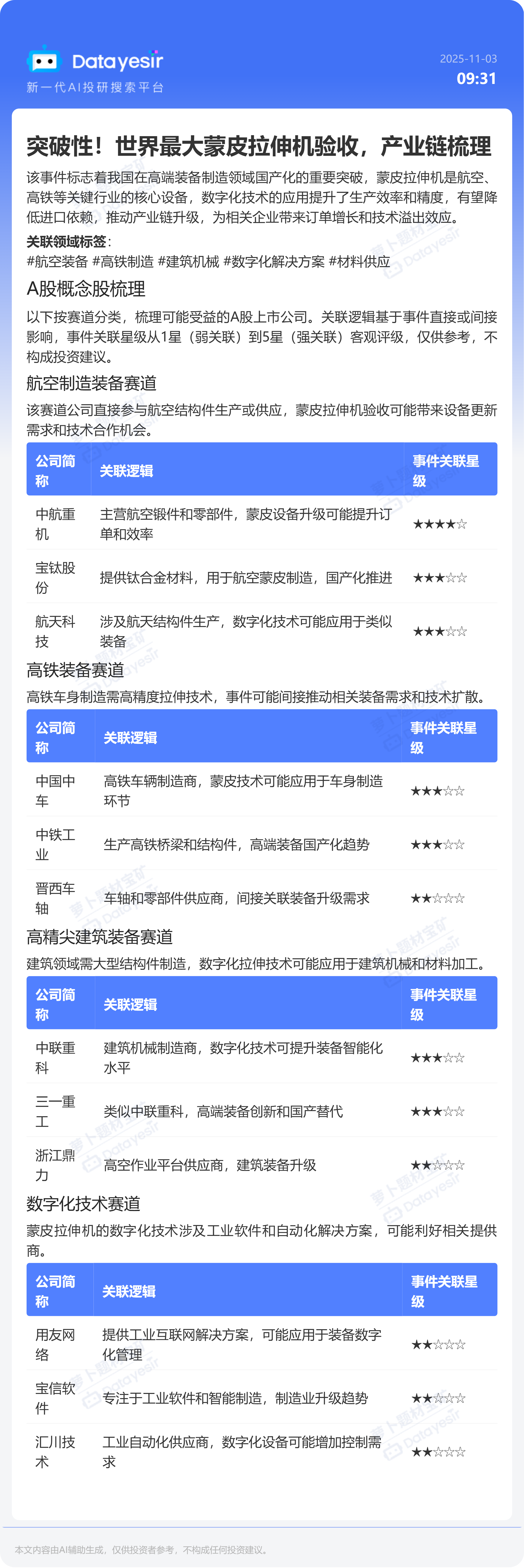 世界最大蒙皮拉伸机正式通过验收。标志着我国在高端装备制造领域国产化的重要突破,蒙皮拉伸机是航空、高铁等关键行业的核心设备,数字化技术的应用提升了生产效率和精度,有望降低进口依赖,推动产业链升级,为相关企业带来订单增长和技术溢出效应。