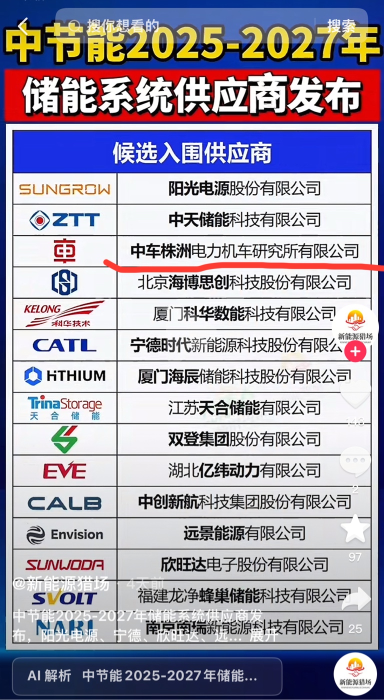 $中国中车(SH601766)$ 储能超级大客户中国节能优质供应商名单