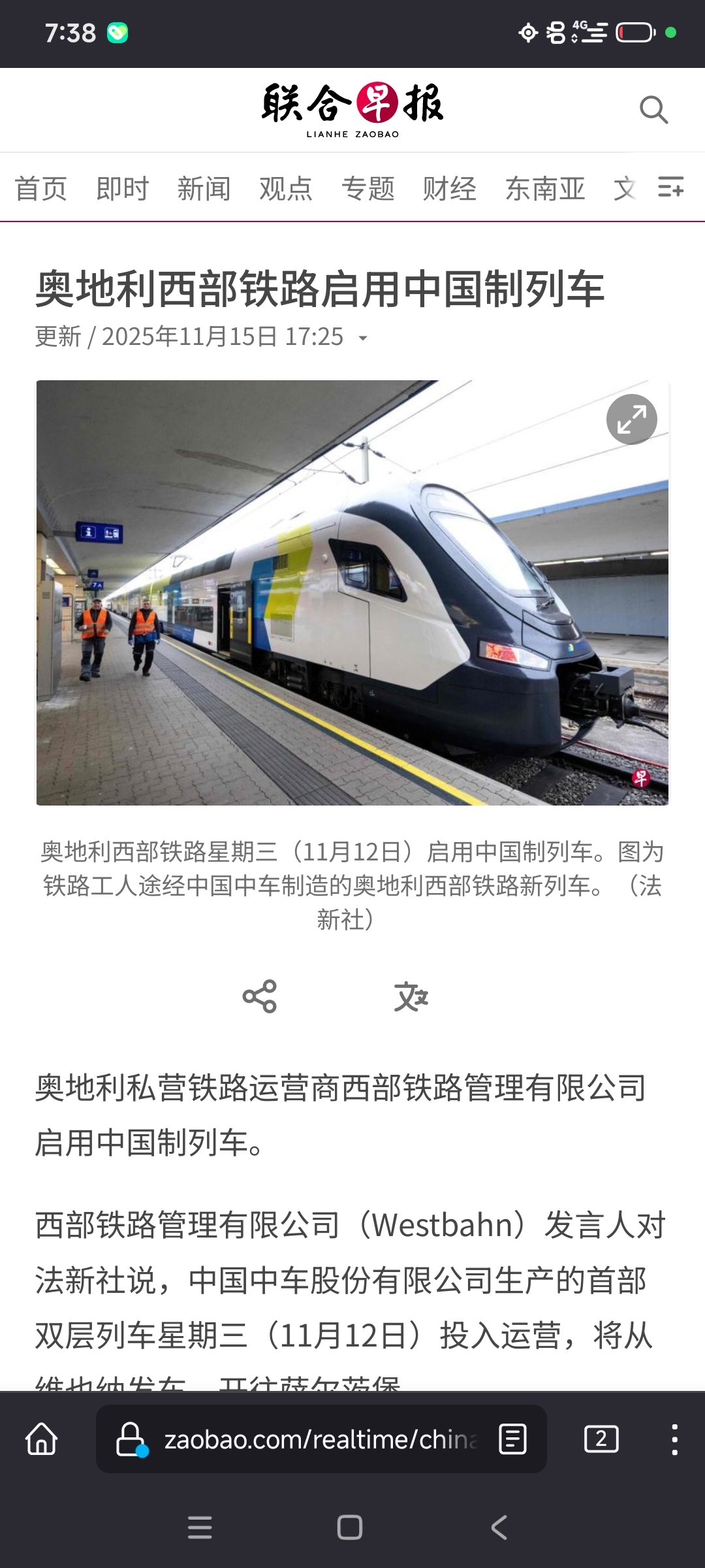 奥地利西部铁路开始使用中国中车制造,联合早报热的