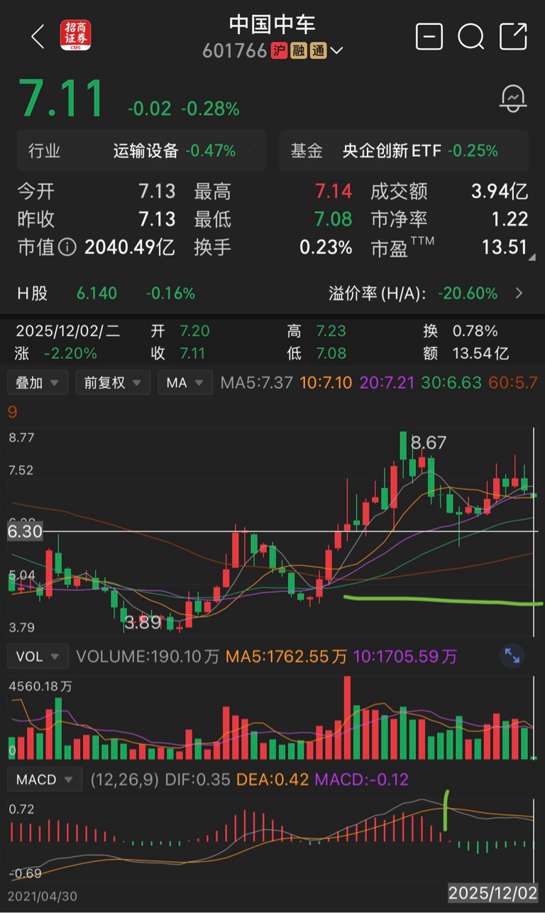 $中国中车(SH601766)$ 短期月底挑战6.30元支撑,明年看5元。中车估值3到5元之间,参考港股中车合理估值。