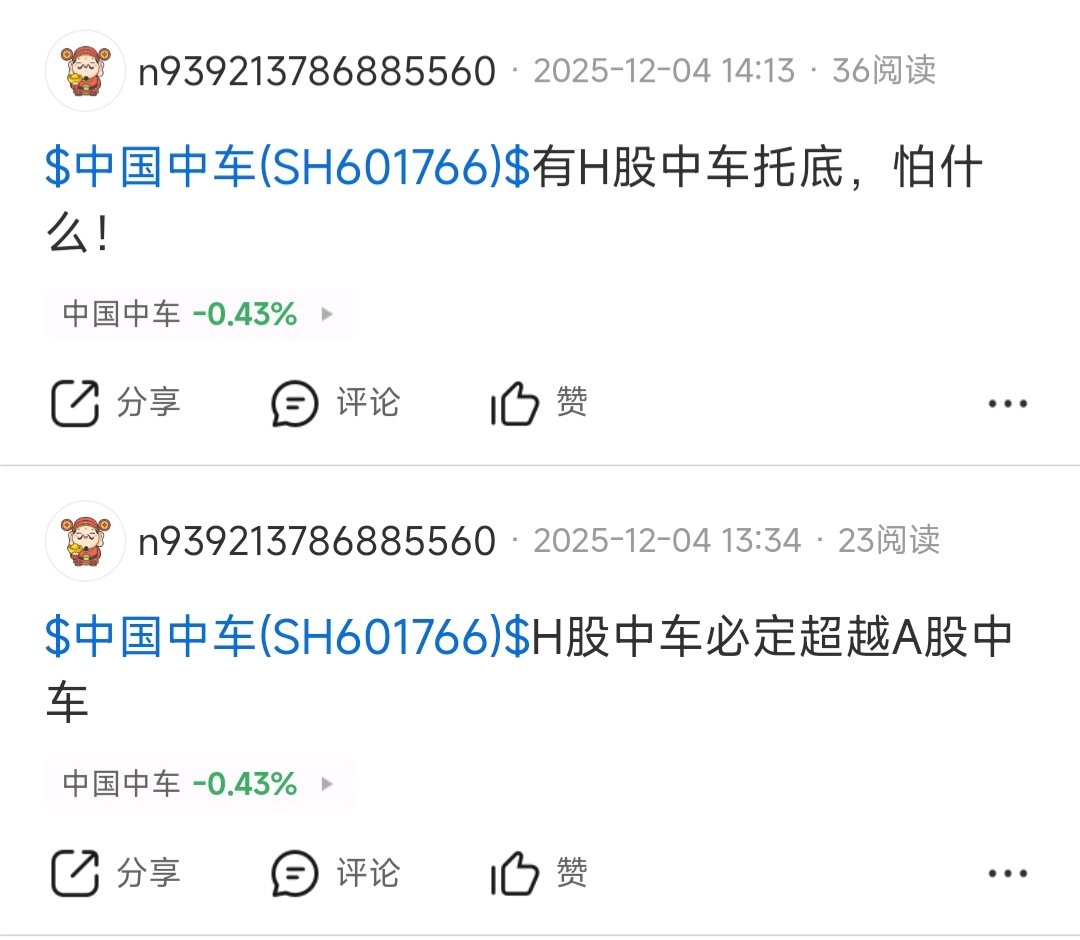 $中国中车(SH601766)$ 这个小丑又出来丢人现眼了,2025年7月1日我发了个帖子,建议买中车就买港股,因为A股中车溢价50%,而且港股通有红利税20%,这个小丑留言嘲笑我说的是胡说八道,结果如何?经过半年时间的证明,港股中车往上走, A股中车往下走,再看看截图,勾东西七年之久的无脑唱多,说了多少自相矛盾的话。