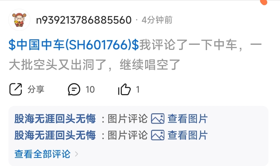 $中国中车(SH601766)$ 小丑,股吧这么多唱多的,为何这么多人就喜欢盯着你一个人喷?如果你还有脑子的话应该比谁都清楚,那么多截图都发出来了,以后每天都会更新几张,让更多的吧友看看这六七年你都干了多少不知羞耻的蠢事!