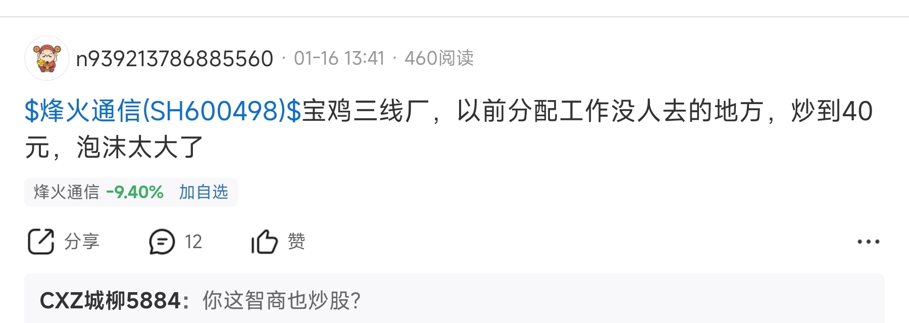 人怎么可以丢人现眼到这种地步了,为了唱空烽火通信,竟然把烽火电子拿出来一顿贬低,