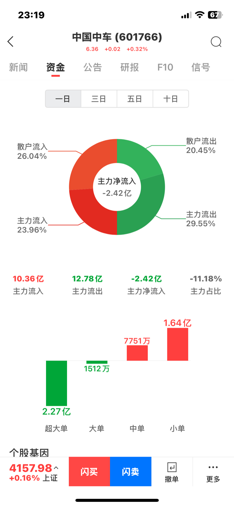 $中国中车(SH601766)$ 冷静下吧,超跌缩量反弹而已!看看主力资金今天跑了多少!