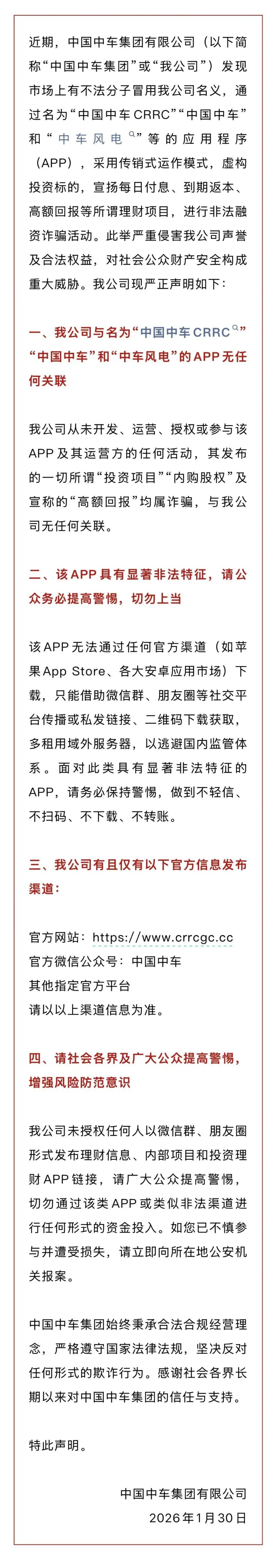 1月31日,中国中车发文称,近期公司发现市场上有不法分子冒用公司名义,通过名为“中国中车CRRC”“中国中车”和“中车风电”等的应用程序(APP),采用传销式运作模式,虚构投资标的,宣扬每日付息、到期返本、高额回报等所谓理财项目,进行非法融资诈骗活动。