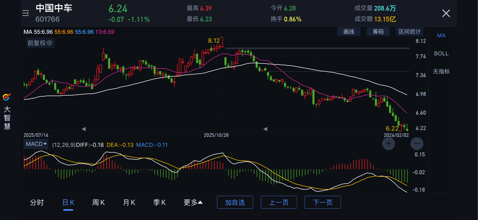 20260202中国中车底背离钝化没有了,但下跌5浪还是很清晰的。今天尝试买入点