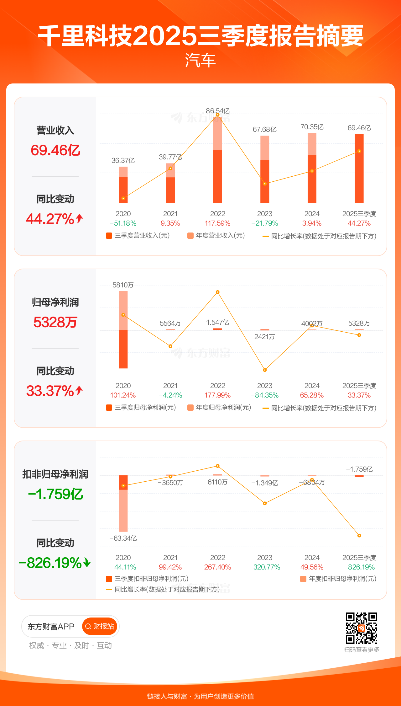 千里科技10月31日发布2025年三季报显示,公司前三季实现营业收入69.46亿元,同比增长44.27%;归母净利润5327.94万元,同比增长33.37%;扣非归母净利润-1.76亿元。