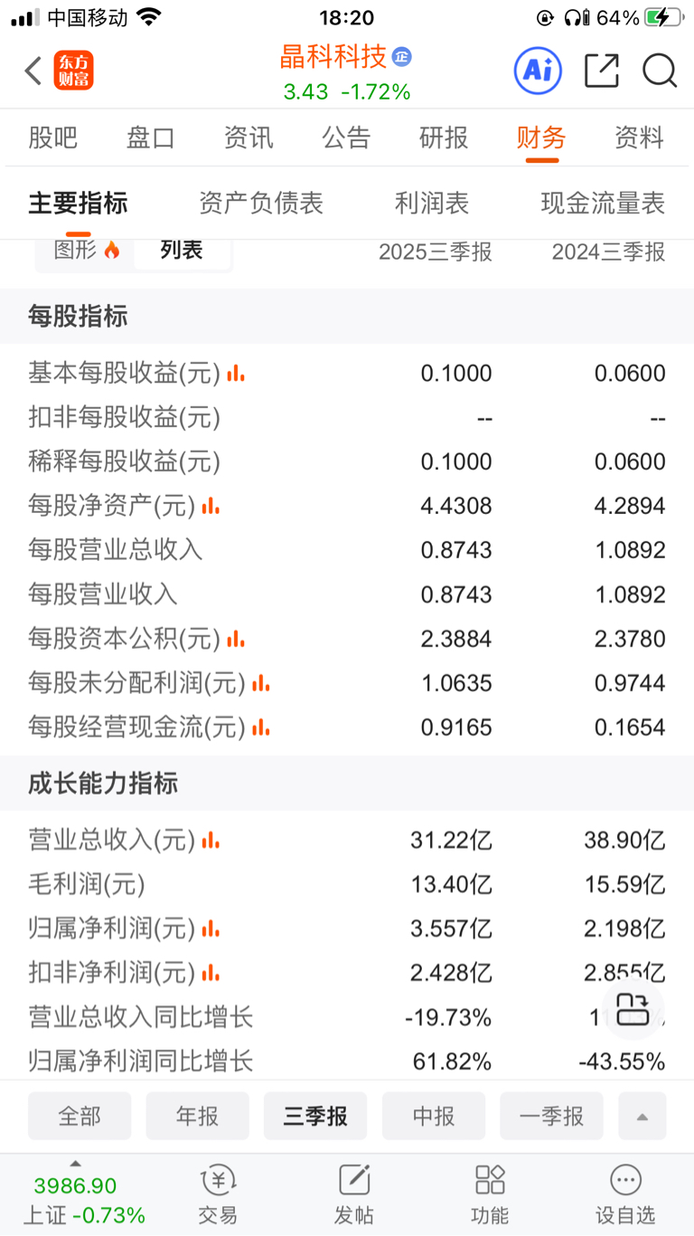 $晶科科技(SH601778)$ 还可以啊,没有亏损.净资产又增加了, 别鸡8在跌了