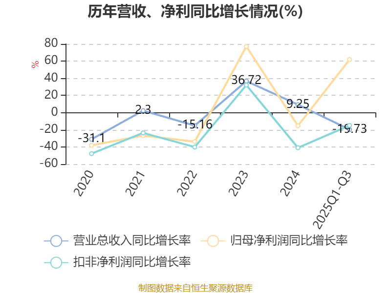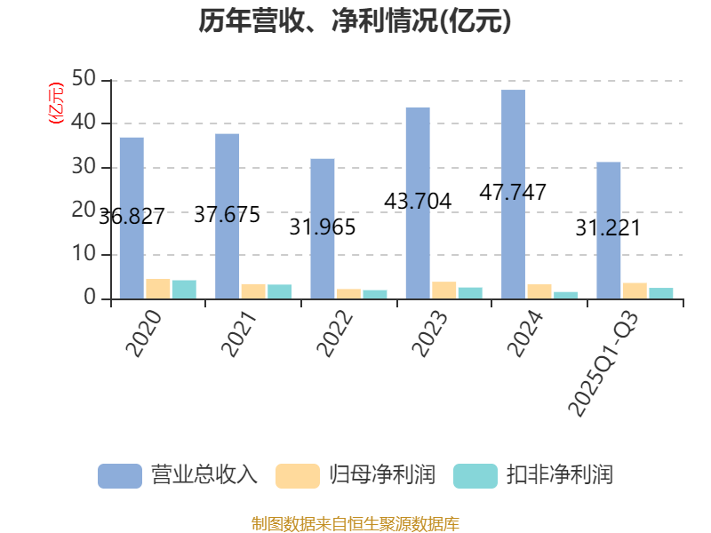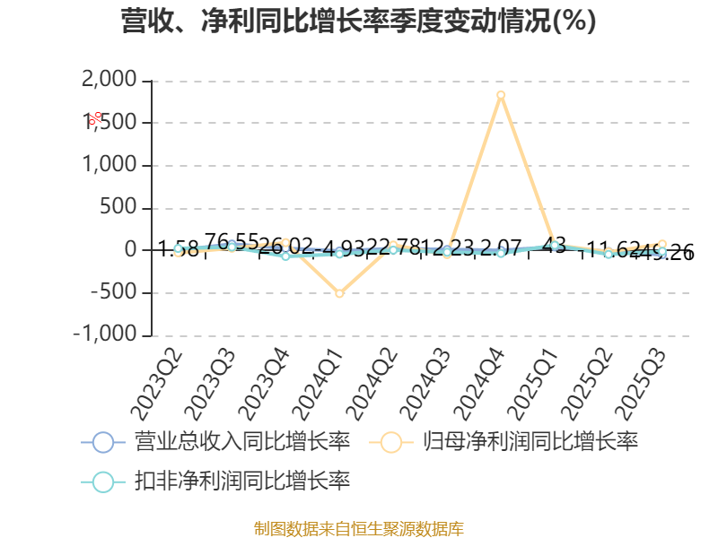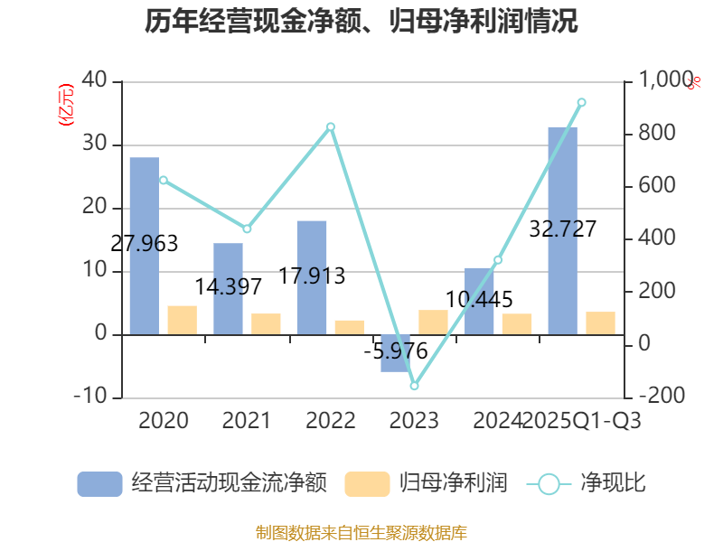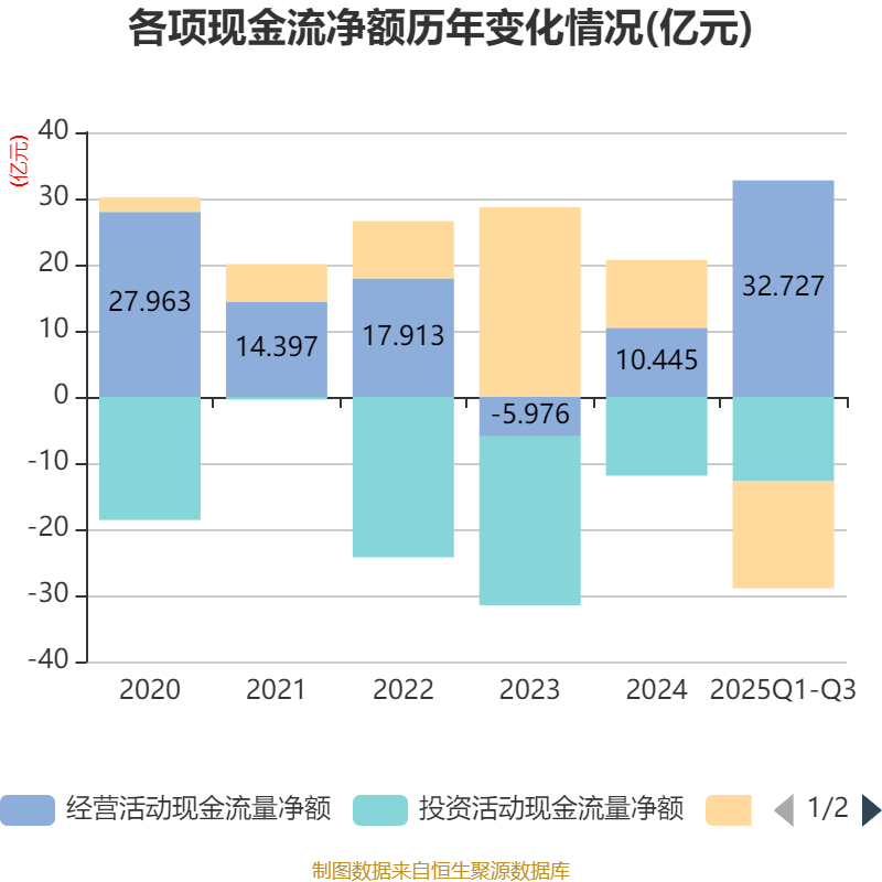 2025年前三季度,公司经营活动现金流净额为32.73亿元,同比增长454.05%;筹资活动现金流净额-16.18亿元,同比减少23.47亿元;投资活动现金流净额-12.76亿元,上年同期为-6.47亿元。