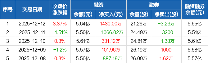 晶科科技:融资净买入1430万元,融资余额5.64亿元(12-12)