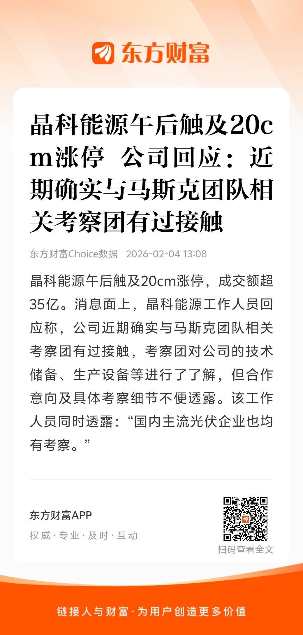 $晶科科技(SH601778)$ 20cm晶科能源承认与马斯克近期有接触