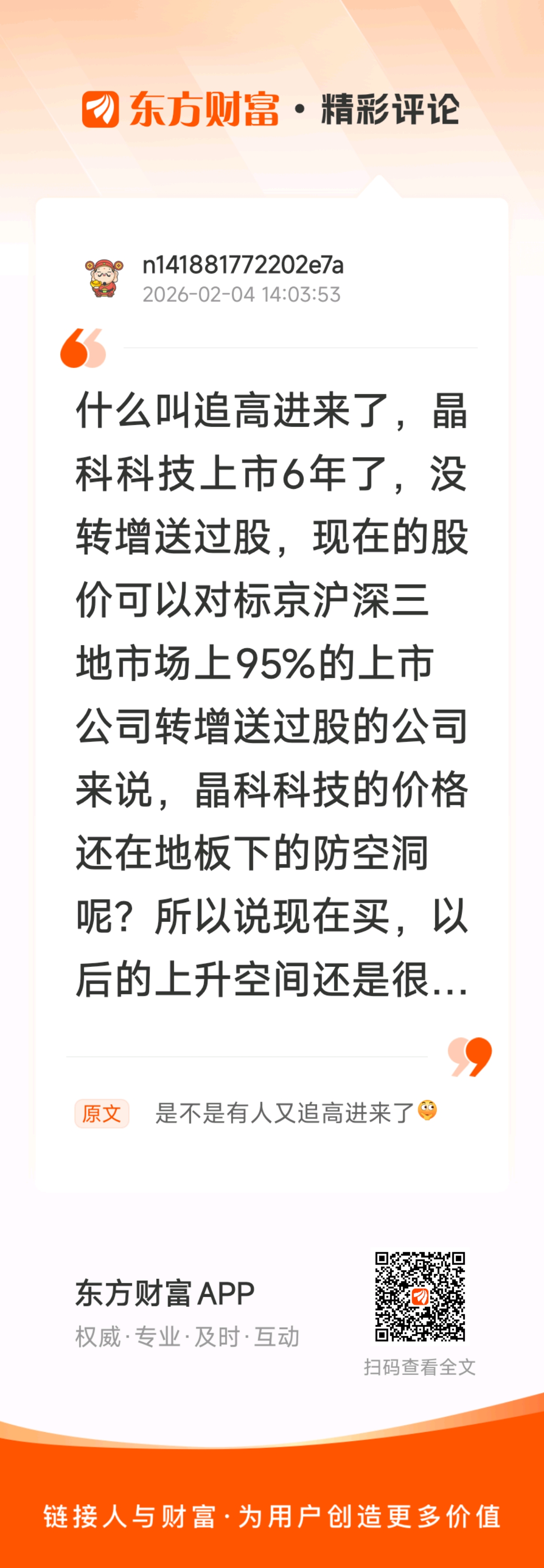 //@n141881772202e7a :什么叫追高进来了,晶科科技上市6年了,没转增送过股,现在的股价可以对标京沪深三地市场上95%的上市公司转增送过股的公司来说,晶科科技的价格还在地板下的防空洞呢?所以说现在买,以后的上升空间还是很大的,珍惜手中的筹码,千万别打丢了。