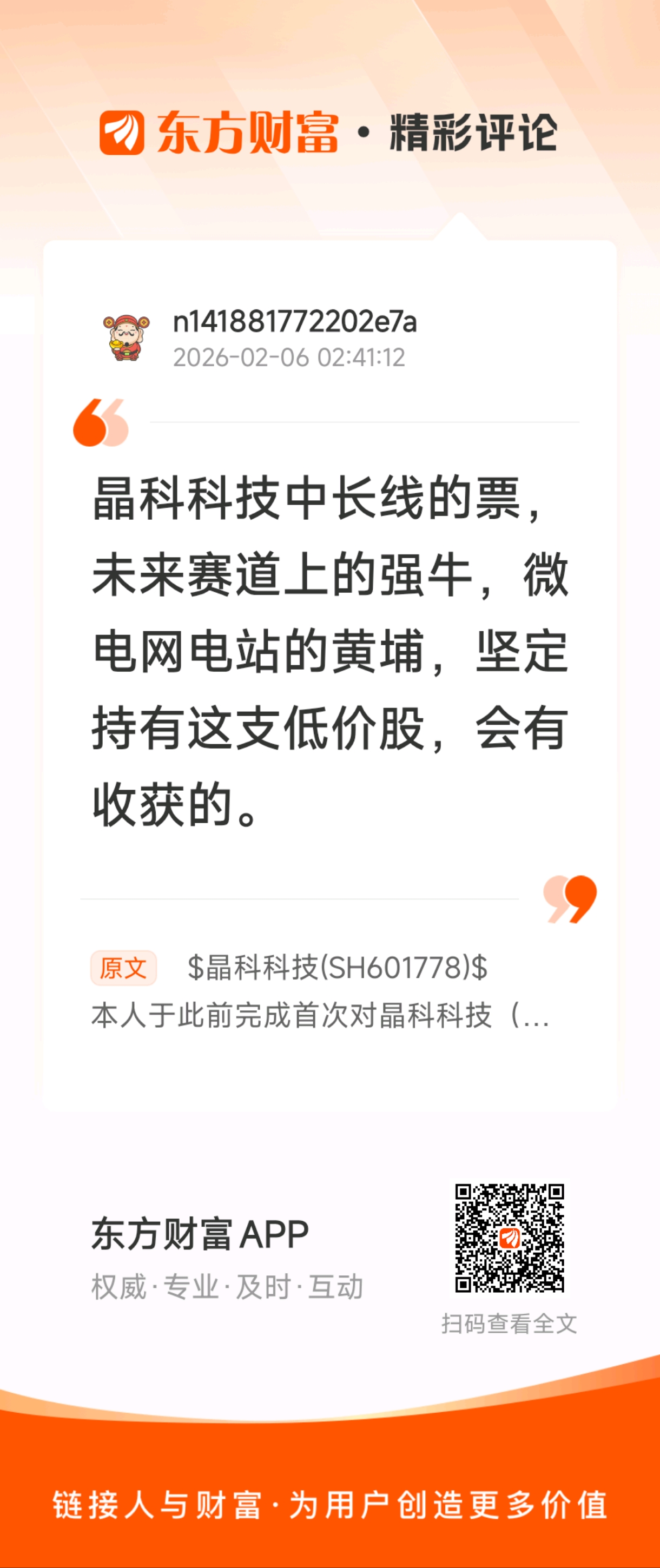 $晶科科技(SH601778)$ 本人于此前完成首次对晶科科技(以下简称公司)增持后,基于对公司长期发展逻辑的持续认可与核心业务增长潜力的坚定信心,于2026年2月5日通过合规渠道再次增持公司股份2500股。本次增持资金来源仍为本人工资结余,与此前披露的资金性质完全一致,不存在任何外部融资或杠杆情况。此次增持并非短期市场判断下的投机行为,而是对"长期持有、共伴成长"投资理念的再次践行,旨在以实际行动持续传递对公司未来价值的信心。需特别说明的是,两次累计5500股的增持规模仍属个人能力范围内的小额投资,始终不期望对公司股价产生直接影响。再次提醒广大投资者,应结合自身风险承受能力、投资周期及独立判断理性决策,切勿将个人增持行为作为投资依据。未来,我将继续紧密关注公司经营动态与战略落地情况,与全体投资者共同见证公司长期价值的稳步释放。