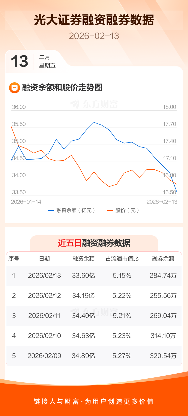 交易所最新数据显示,光大证券于2026年2月13日获融资买入3121.95万元,融资偿还9026.85万元,当日融资净偿还5904.9万元。目前,该股融资余额33.60亿,占流通市值比例为5.15%。