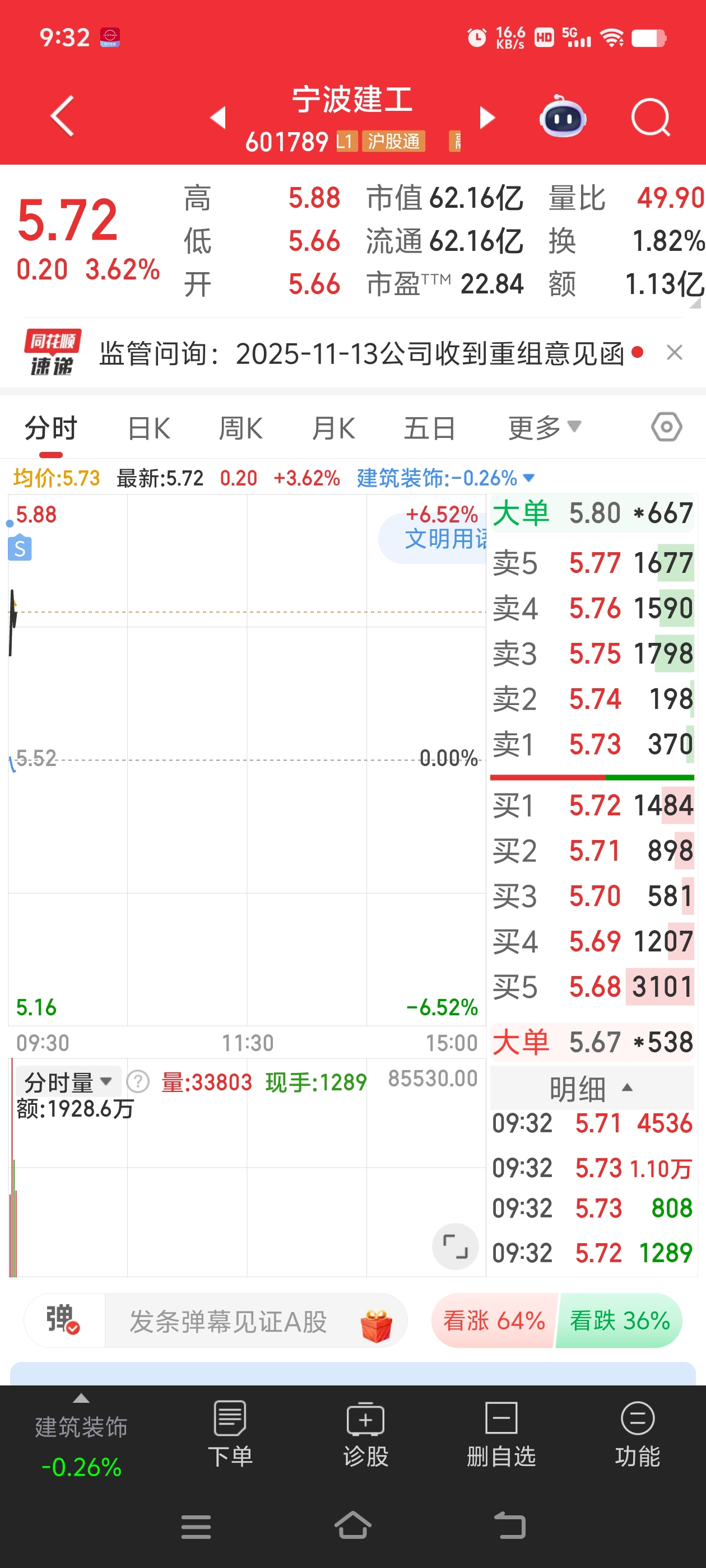 $宁波建工(SH601789)$ 集合竞价我挂了5.74.开盘居然卖在5.84,白捡1毛钱