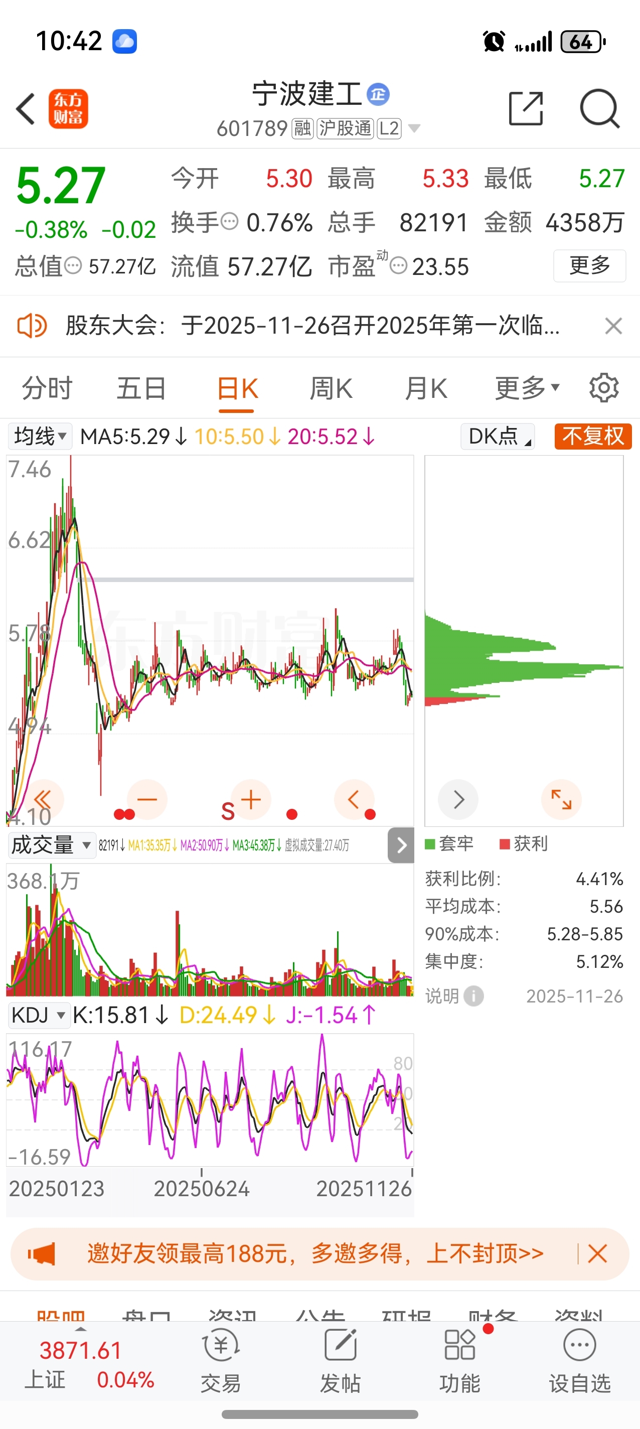 $宁波建工(SH601789)$ 这个票过来人奉劝你们一句,碰都不要碰,前面都是放量拉伸拉不起来,后面缩量杀起来不留情,本来跟随大盘杀跌里面肯定有资金被套,筹码峰三峰鼎力,筹码不集中在主力手里,今天拉一拉上不去又砸下来,一般的主力都是急拉上去解救前几天大盘大跌的筹码,但很明显不打算这么做,又要做小级别的箱体洗盘,纯属浪费时间,这个票不大跌挖坑起不来,筹码更不可能集中,主力没脑子
