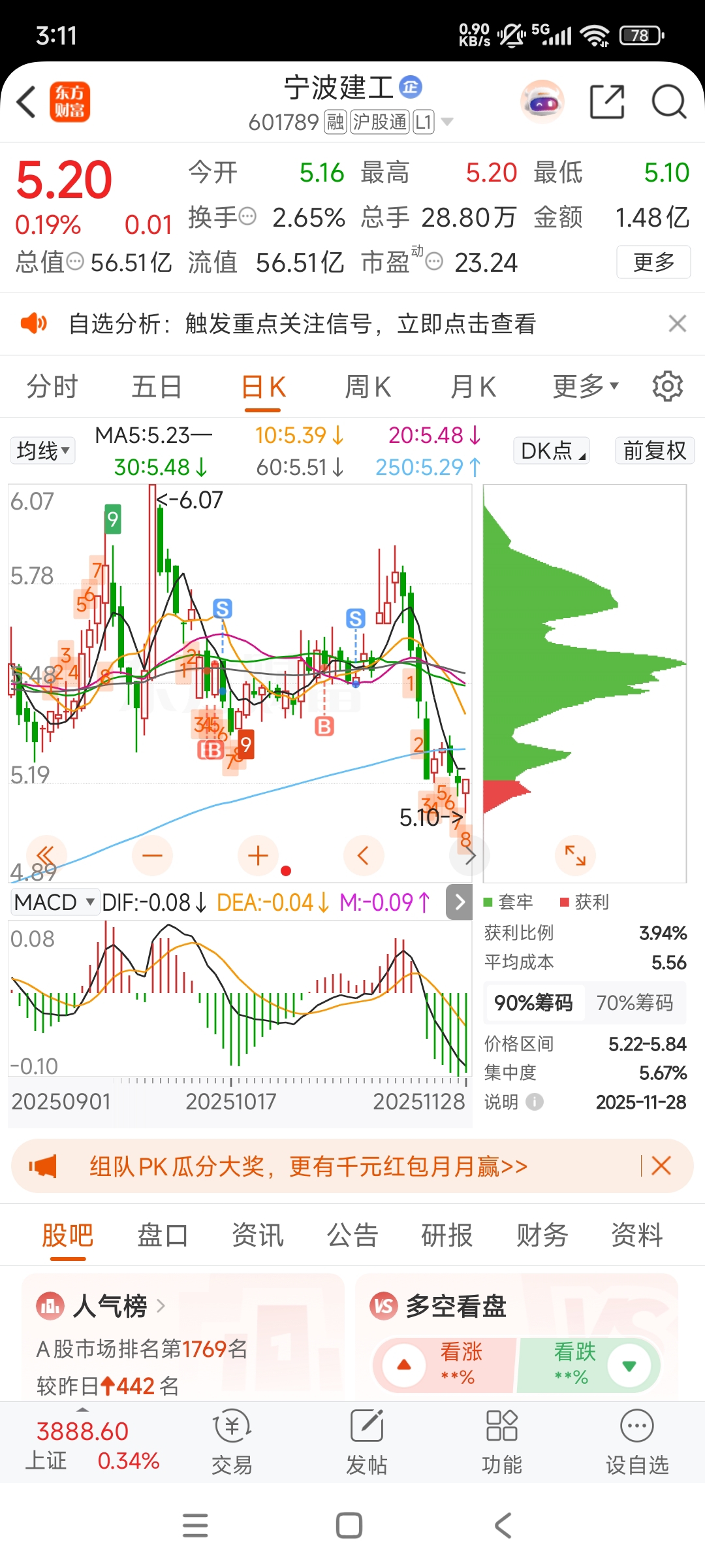 $宁波建工(SH601789)$ 连续2周都是520收盘,看来主力对散户是真爱,哈哈哈。上周五是当天最低价收盘,今天是金针探底,在当天的最高价收盘,主力这么喜欢520,这个操盘手会不会是恋爱脑