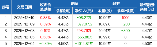 融资方面,当日融资买入1068.16万元,融资偿还1166.44万元,融资净偿还98.27万元。融券方面,融券卖出1000股,融券偿还0股,融券余量10.99万股,融券余额57.48万元。融资融券余额合计4.43亿元。