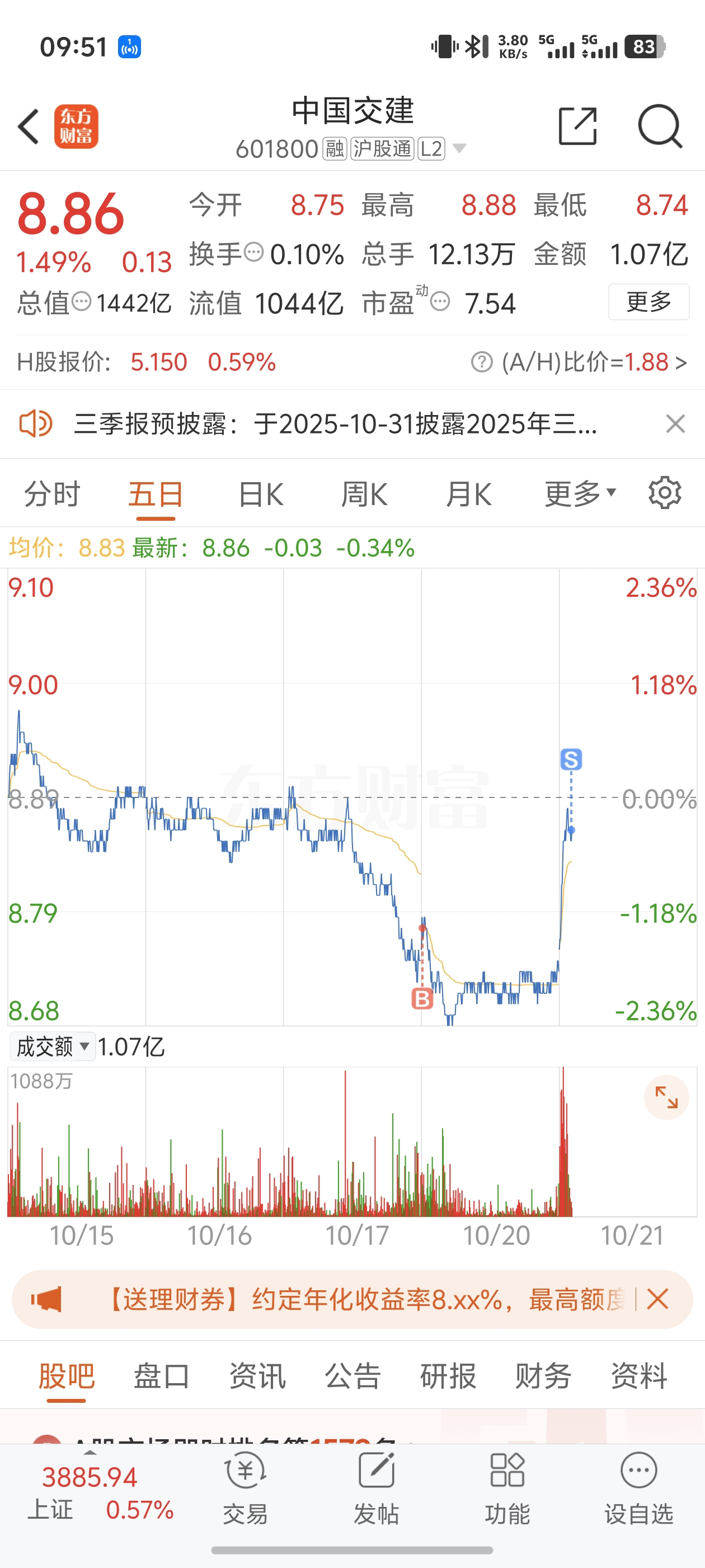 $中国交建(SH601800)$ 昨天高开买的,今天卖了,5000股,没亏钱,几百块钱