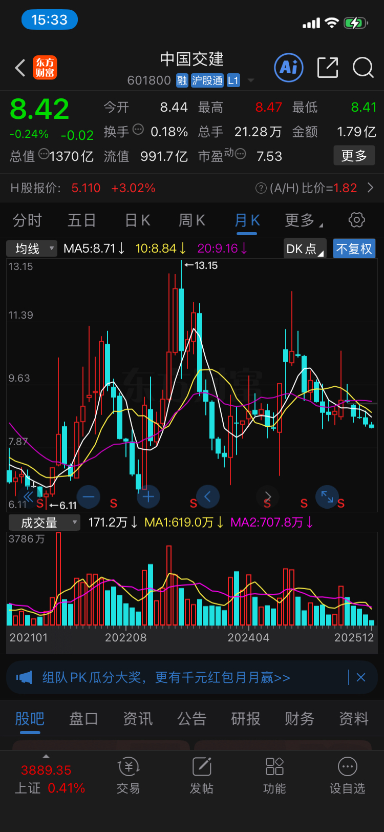 $中国交建(SH601800)$ 月线5连阴已称定局