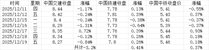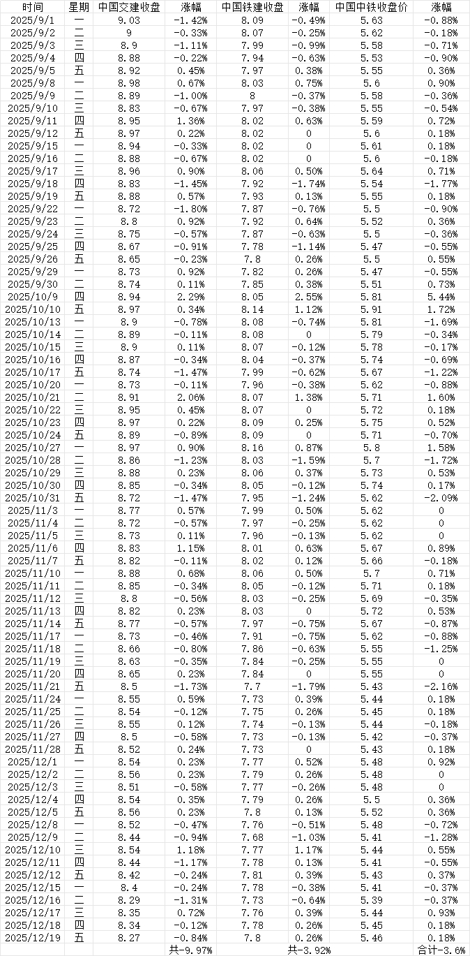 9.1号到今天收盘交建跌幅-9.9%铁建跌幅-3.92%中铁跌幅-3.6%近八个