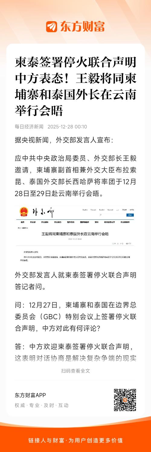 答:中方欢迎柬泰签署停火联合声明,这表明对话协商是解决复杂争端的现实有效途径,中国、东盟以及国际社会也为此做出了共同努力。中方愿为柬泰双方开展更全面、具体沟通继续提供平台、创造条件。中共中央政治局委员、外交部长王毅将于12月28日至29日在云南同柬埔寨副首相兼外交大臣布拉索昆、泰国外交部长西哈萨举行会晤,三国军方代表也将参加。中方将以自己的方式为柬泰巩固停火局面、恢复彼此交往、重建政治互信、实现关系转圜、维护地区和平发挥建设性作用。