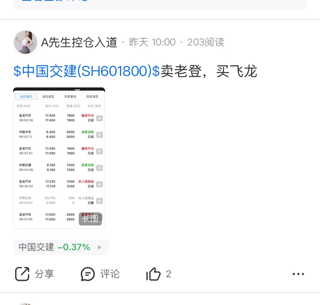 $中国交建(SH601800)$ 昨天上午,卖老登,买飞龙,今天赚板,