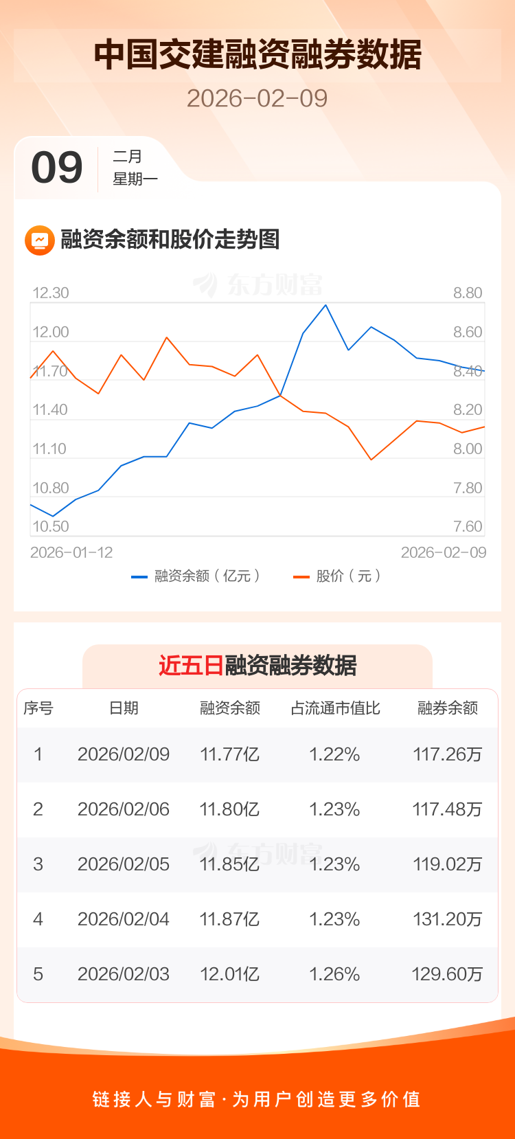 交易所最新数据显示,中国交建于2026年2月9日获融资买入1830.74万元,融资偿还2198.88万元,当日融资净偿还368.14万元。目前,该股融资余额11.77亿,占流通市值比例为1.22%。