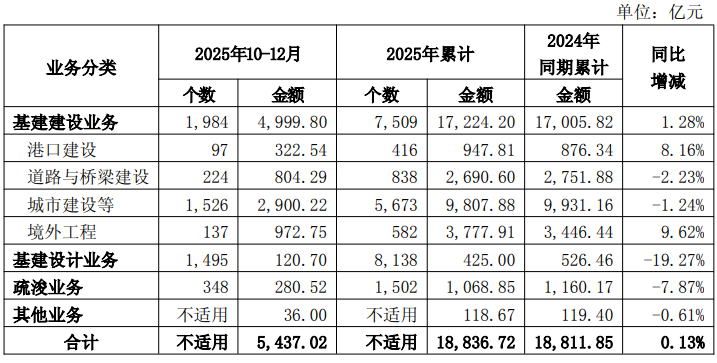 其中,基建建设业务、基建设计业务、疏浚业务和其他业务的合同额分别为1.72万亿元、425亿元、1068.85亿元和118.67亿元。