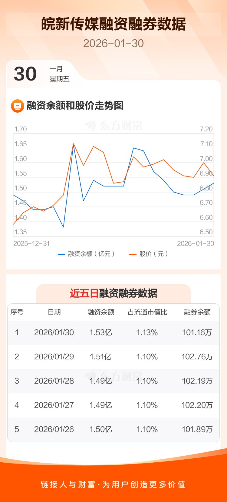 交易所最新数据显示,皖新传媒于2026年1月30日获融资买入1329.76万元,融资偿还1183.87万元,当日融资净买入145.89万元。目前,该股融资余额1.53亿,占流通市值比例为1.13%。
