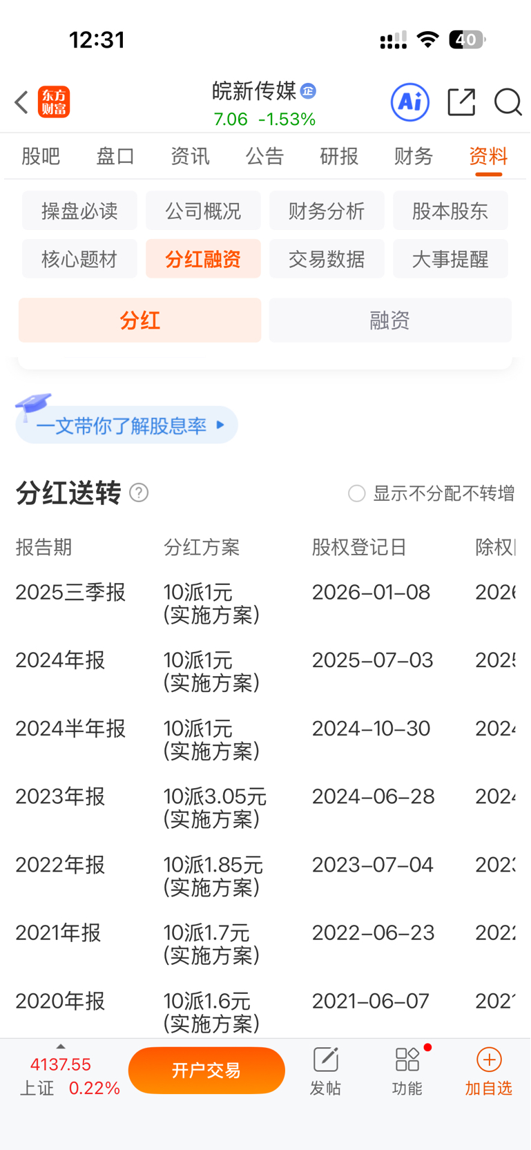 $皖新传媒(SH601801)$ 有没有朋友是长期拿的,这个票饭分红和银行比咋样,大概股息率多少