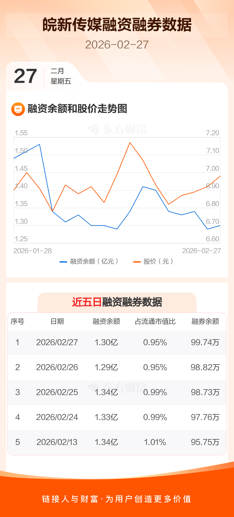 交易所最新数据显示,皖新传媒于2026年2月27日获融资买入1266.38万元,融资偿还1162.49万元,当日融资净买入103.9万元。目前,该股融资余额1.30亿,占流通市值比例为0.95%。